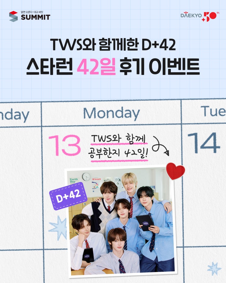 안녕하세요! 대교 전주 덕진 Hive입니다. 새 학기의 설렘으로 시작한 공부가 어느덧 42일이라는 소중한 시간을 맞이하고 있습니다. 공부 습관이 잡히기 시작하는 이 시점에 TWS와 함께하는 대교 써밋 스타런이 아주 특별한 이벤트를 준비했습니다. 아이들의 성장과 변화를 소개해 주시고 풍성한 선물도 받아 가세요! ✨ TWS와 함께한 D+42일 대교 써밋 스타런 42일 후기 이벤트 이번 이벤트는 특별한 의미가 담겨 있어요~ TWS의 팬덤 명인 ‘42(사이)’를 기념함과 동시에, 새 학기 시작 후 딱 42일이 되는 4월 13일에 맞춰 우리 아이들이 그동안 얼마나 성장했는지 되돌아보기 위해 기획되었답니다. 단순한 이벤트 참여를 넘어, 우리 아이가 대....... <img src="https://blogthumb.pstatic.net/MjAyNjA0MDdfMzAg/MDAxNzc1NTI2NjczMTc4.mU70kxcYOSBQ4d7i2e5jNyRu8-ZEtAVocvshNSgVzI4g.kyrSw0tGAbNb8FZYNs8maFMBqjPdIpXsK-CRHMYpCcUg.JPEG/%B4%EB%B1%B3_%BD%E1%B9%D4_%BD%BA%C5%B8%B7%B1_%C7%D0%BD%C0_%C8%C4%B1%E2_%C8%B0%BF%EB_%C0%CC%BA%A5%C6%AE_IG_1.jpg?type=s3" />