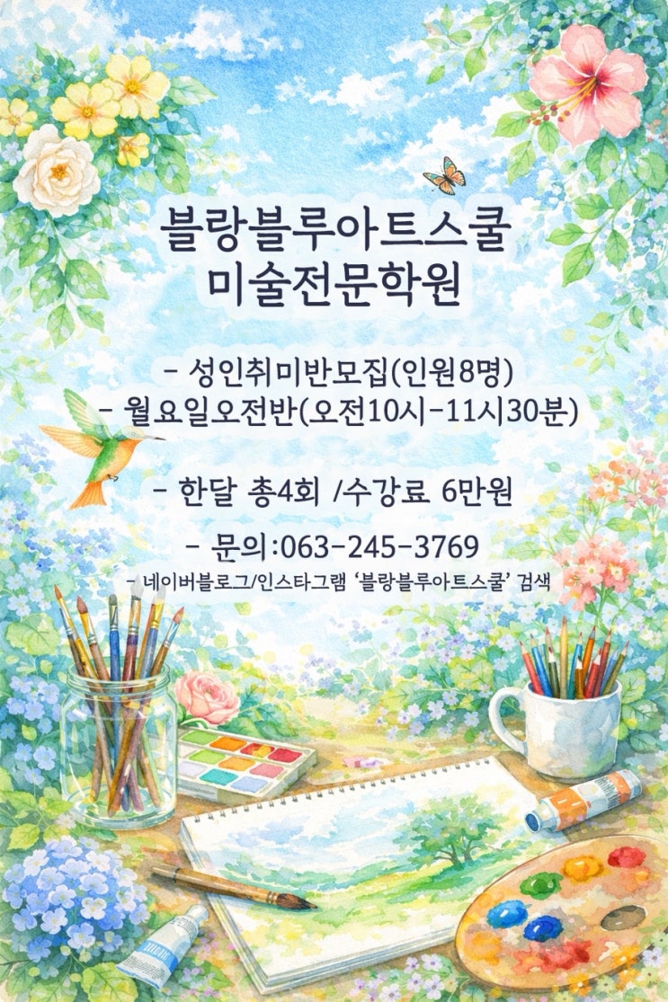 ——————————————————— 블랑블루아트스쿨 성인취미미술 성인 취미미술 클래스는 그림 실력보다 편안함과 즐거움을 먼저 생각합니다. 처음 붓을 잡는 분도 부담 없이, 차분한 분위기에서 자연스럽게 그림을 배울 수 있어요. • 원데이 클래스로 가볍게 체험 • 평일 오전·오후 / 직장인 저녁반 운영 • 토요일 주말 수업 가능 • 1:1 개인 맞춤 수업 가능 잘 그리기보다, 그리는 시간 자체가 힐링이 되는 수업. BLANC BLUE ART SCHOOL ♥️ 위치:가련산로23 (하가지구) 문의:063-245-3769 주차:건물내지하주차장/공영주차장 #전주성인미술#전주하가지구#하가지구#전주미술#전주취미#전주취미미술#전주원데이클래스#전주....... <img src="https://blogthumb.pstatic.net/MjAyNjAzMjRfMTM2/MDAxNzc0MzMxNDc4NjE5.Hcdrk7oBIma3rwDnD_gTfpmBobOG5KI35ug7IcKwbyog.hlqPgPUehHyeHc1vnziB8lpNQokjJshe7ZiCJ3Oq25Mg.JPEG/IMG%A3%DF1193.JPG?type=s3" />