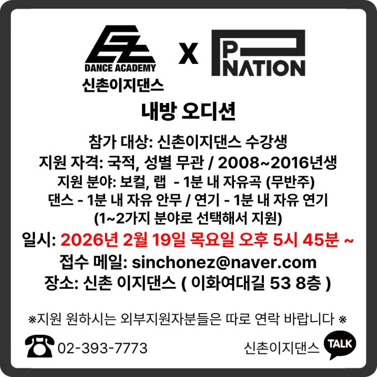 #홍대댄스학원 #오디션학원 #이지댄스신촌점 26년 2월 #내방오디션 공지 안녕하세요!! 랭키닷컴 1위 홍대댄스학원 #댄스학원 #신촌이지댄스 입니다=!! 저희 홍대댄스학원 오디션학원 #이지댄스 신촌점에서는 매달 #비공개오디션 내방오디션이 진행되고 있는데요! -! 이번에 2월 내방 #오디션 진행 예정인 곳은 #PNATION #피네이션 입니다-!! 한류의 선두주자인 #psy #싸이 를 필두로, #crush #크러쉬 , #헤이즈 #heize , #화사 #hwasa , 최근 새롭게 선보인 #걸그룹 #베이비돈크라이 #babydontcry 등이 속해있는 소속사인데요!! __ 일시 - 2026년 2월 19일 목요일 오후 5시 45분~ 지원자격 - 국적, 성별 무관, 2008~2016년생 지원분야 -....... <img src="https://blogthumb.pstatic.net/MjAyNjAxMjBfNTAg/MDAxNzY4OTA4Nzc1MTYy.aN_oD2ftjrZCruwst2uBV3okV3jqK28gX6gFNwPmWMog.2-G8wGWtcuUEf2nzXxWl9hw5IQYTxNR5ZcAJsyM6DAwg.JPEG/26%B3%E2_2%BF%F9_19%C0%CF_%C7%C7%B3%D7%C0%CC%BC%C7_%BF%C0%B5%F0%BC%C7_%B0%F8%C1%F6.jpg?type=s3" />