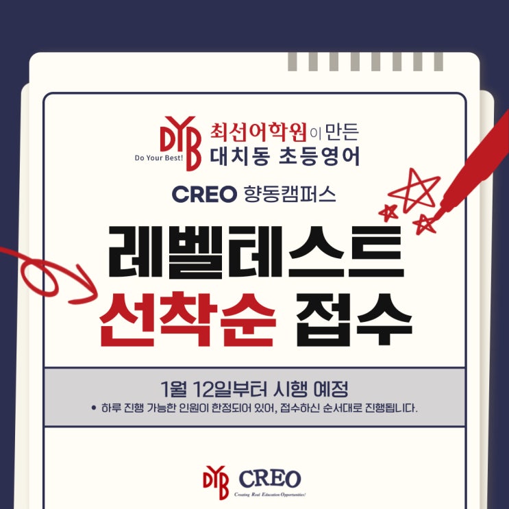 안녕하세요 :) 최선어학원이 만든 대치동 초등영어 크레오어학원에 대한 관심이 뜨겁습니다. 우선 설명회의 경우, 1차 접수는 마감되었습니다. 빠르게 마감된 나머지, 2차로 자동 대기 넘어가신 경우가 많아 2차 설명회 일정을 본사와 조율중입니다. 많은 관심 감사합니다 :) 늦게 신청하신 분들의 경우 2차 설명회도 곧 마감될 수 있음을 양해 부탁드립니다. 또한, 1월 24일 설명회 전 미리 레벨테스트 및 입학 상담을 원하시는 경우가 많아 사전 레벨테스트를 지난 주 오픈한 이후 하루에도 많은 분께서 신청을 주셔서 일정을 잡고 있는 상황입니다. (비재원생 한정, 재원생은 원에서 일괄 시행 예정) 혹시 1월 중 상담을 원하신다면, 빠른 신....... <img src="https://blogthumb.pstatic.net/MjAyNTEyMjlfMTM3/MDAxNzY2OTc3ODkyNjM3.DoaN63D4q-bks6s2XbOjtK6uR9IiGrWmWC5JXc9oAkMg.OoLN-tGAPhiT622genfeQVSayRlg2B3yD8tH15TXVXog.JPEG/creo_%B7%B9%BA%A7%C5%D7%BD%BA%C6%AE_%BE%CB%B8%B2.jpg?type=s3" />