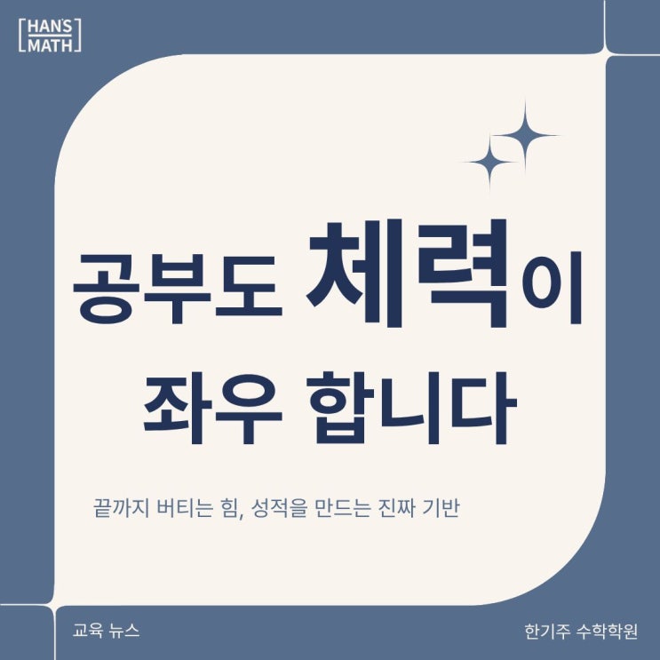 안녕하세요~ 언제나 정성을 다하는 30년 수학교육 전문 한기주 수학학원입니다! 오늘은 공부 이야기를 하면서도, 많은 학생과 학부모님들이 놓치기 쉬운 한 가지를 이야기해보려 합니다. 바로 체력입니다. 「이루고 싶은 게 있다면, 체력을 먼저 길러야 합니다」 드라마 미생에 이런 말이 나옵니다. “네가 종종 후반에 무너지는 이유, 데미지를 입은 후 회복이 더딘 이유, 실수한 후 복구가 느린 이유, 다 체력의 한계 때문이야.” 이 문장은 공부하는 아이들에게도 그대로 적용됩니다. 처음엔 잘 따라가다가 시험 막판에 집중력이 떨어지고, 한 번 틀리면 멘탈이 흔들려 연달아 실수하고, 성적이 한 번 내려가면 다시 끌어올리는 데 시간이 오....... <img src="https://blogthumb.pstatic.net/MjAyNTEyMjZfODEg/MDAxNzY2NzMyMDk1MDEx.BC6DG-PIyLxbJYD15X6ru6M4Z9tn-qABEmCgN338Zugg.hUPFIoZTROHnYSizuQ__N2sjoFF_qLpwsaPBQHX1spog.JPEG/1.jpg?type=s3" />