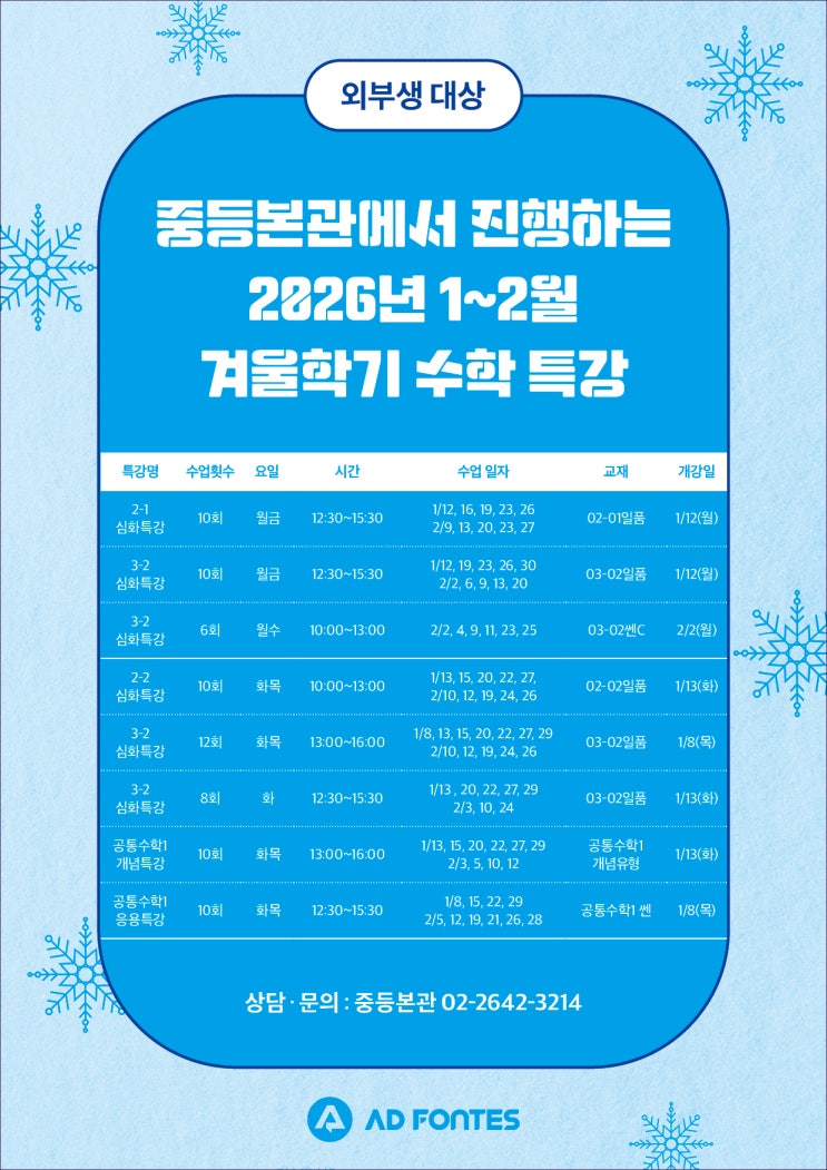 안녕하세요, AD FONTES 학원입니다 외부생 대상, 2026년 1~2월 수학 특강 일정을 안내드립니다. 수업은 학년별·레벨별로 구성되며, 기초 보완부터 심화·선행까지 단계별로 진행됩니다. 아래 이미지를 통해 자세한 일정을 확인해주세요. 수강 신청: https://x.gd/yPih2 문의: 중등본관 02-2642-3214 ★ 더 많은 정보는 카카오채널에서 확인하세요! [아드폰테스 수학학원] 카카오채널 바로가기 → http://pf.kakao.com/_rxfwan <img src="https://blogthumb.pstatic.net/MjAyNTEyMjdfNzkg/MDAxNzY2ODEwNDk5NDEx.J9xe9ikEdtmm8eFRxmSFdRxfjLwYjwYCnthIODIWeH0g.QiMs6PHgZMWgwB_XX1KjRpdk-Y_ANsfu25p34mA31yAg.JPEG/2025_%BF%DC%BA%CE%BB%FD_%BC%F6%C7%D0%C6%AF%B0%AD.jpg?type=s3" />