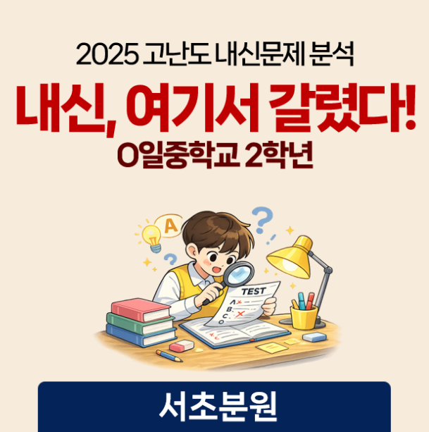 안녕하세요 정상어학원 서초분원입니다. 2026년 새학년, 새학기 마지 학습전략 시리즈인 "2025 내신, 여기서 갈렸다!" 오늘은 그 세 번째, O일중학교 시험 문제를 가져왔습니다. 작년 중학교 내신문제 중 학생들이 많이 틀렸던, 또는 고난도라 할 수 있는 문제들을 선별하여 분석하여 , 학생들로 하여금 2026년 내신준비에 큰 그림을 그릴 수 있도록 합니다. (블로그에 업로드 되는 문항은 해당 학교의 출제경향을 바탕으로 변형 제작한 예시문항임을 밝힙니다.) 작년 시험에서 많은 학생들이 틀린 문제, 올해는 정상어학원 서초분원에서 미리 준비하세요! 이 문제, 왜 어려웠을까? 뜻은 맞아 보이는데, 구조가 틀린 문장을 구별해야 했....... <img src="https://blogthumb.pstatic.net/MjAyNjAzMDRfMjI0/MDAxNzcyNjA5MDU0MzY3.PbtEEFqBhtxdFxUVWBUGsyh7Svq3w9gf01xIuDJzcIsg.sovBqKUDuri_RLXN5sXH06OPI6RuHgMd2VxpGYZ2sucg.PNG/%BD%BA%C5%A9%B8%B0%BC%A6_2026-03-04_162148.png?type=s3" />