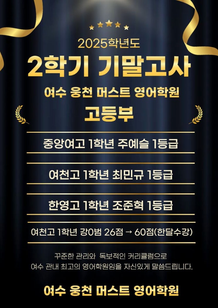 안녕하세요 머스트 영어학원 원장 손 빛나입니다. 힘들었지만 값진 기말고사 시즌이 끝나고, 아마도 지금부터 시작이라고 해도 과언이 아닐 만큼의 더!! 치열해질 겨울방학의 레이스가 시작되었습니다. 방학기간은 학습에 있어 전력을 다해 질주해야 하는 구간이라고 생각합니다. 특히 겨울방학 약 2개월은 내년에 본인의 성적'농사'의 성패를 쥐는 열쇠라고도 말씀드리고 싶네요. 공부는 선생이 시키는 것도 아니고, 부모가 시키는 것도 아닙니다. 자신의 의지와 동기가 촉진제가 되어 스스로 학습해야 합니다. 하지만 학생들은 자신의 길 위에서 주저하기도 하고 다른 방향으로 힘없이 끌려가기도 합니다. 이런 우리 학생들이 올바른....... <img src="https://blogthumb.pstatic.net/MjAyNTEyMjdfMjYx/MDAxNzY2ODQ3MzUzMDQw.HTpBnwoRaJStUPJHcOjmf4_ilZP_QymqAt6WcE7HaKkg.8o-RK3TFsCMhdAqMS8fuAw5dFIkOaG1E7ZKBMc-xu0Qg.JPEG/2025%C7%D0%B3%E2%B5%B5_2%C7%D0%B1%E2_%B1%E2%B8%BB_%B0%ED%B5%EE%BA%CE_%BA%ED%B7%CE%B1%D7.jpg?type=s3" />