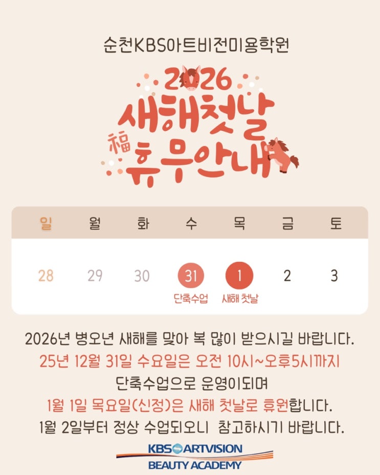안녕하세요 순천 KBS아트비전미용학원입니다! 어느새 2025년의 마지막이 다가오고 있네요 다가올 2026년 병오년, 새로운 한 해에도 행복과 행운이 가득하시길 진심으로 바랍니다✨ 이번 글에서는 연말 단축수업 및 새해 첫날 휴무 일정을 안내드리니 수업 일정 참고하셔서 학원 이용에 착오 없으시길 부탁드립니다 12월 31일은 수업 시간이 단축되며 1월 1일(목 / 신정)은 새해 첫날을 맞아 휴원합니다. 휴원일에는 모든 수업이 진행되지 않으니 참고 부탁드립니다! 이후 1월 2일부터는 평소와 동일하게 정상 운영됩니다!! 2025년 한 해 동안 열심히 달려온 우리 학생분들, 그리고 늘 응원해주신 학부모님들 덕분에 순천 KBS아트비전미....... <img src="https://blogthumb.pstatic.net/MjAyNTEyMzBfMjQ4/MDAxNzY3MDYxODU0MTQ2.zLg-3jsTc4rf-mrJ_jlZzFEiFLvDpUFaLw5nMblOG6wg.FyFgRXMzBfNvTV3cA5-ArjTomAyDvP-KxWxOZrtC4_sg.JPEG/IMG%A3%DF8612.jpg?type=s3" />