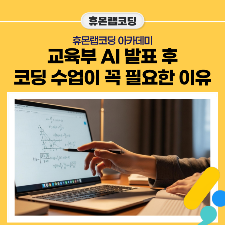 안녕하세요! 스스로 생각하는 힘을 키우는 휴몬랩코딩 아카데미 입니다. 최근 교육부에서 발표한 'AI 인재 양성 방안' 보셨나요? "하루가 늦으면 한 세대가 뒤처진다"라는 문구가 참 무겁게 다가오고 있습니다. 안 그래도 챙길 게 많은 우리 아이들인데, 이제 AI까지 필수가 되었다니.. 어머님들의 고민이 깊어지는 소리가 여기까지 들리는 것 같습니다. 오늘은 그 발표 내용이 우리 아이의 입시와 미래에 어떤 실질적인 영향을 주는지, 우리는 무엇을 준비해야 하는지 쉽게 풀어서 말씀드리겠습니다. AI 인재 양성 방안, 꼭 코딩이 필요한가요? 사실 부모님의 가장 큰 걱정은 이거입니다. "우리 애는 국영수 하기도 벅....... <img src="https://blogthumb.pstatic.net/MjAyNTEyMzBfMTUy/MDAxNzY3MDgyNDYxMTY3.TCYZk7KKcYbZ8-wIOLNoTkYbsLKyalSF-bjF2M9zT6Yg.oB_6BHqTKLDbNYgakghuiX00kQm0k6ECxLRwZhIMiREg.PNG/%BA%ED%B7%CE%B1%D7-013_%282%29.png?type=s3" />