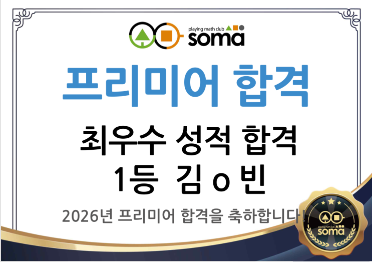 안녕하세요. 신도림 소마입니다. 저희 소마에서의 프리미어 과정은 고학년 대비를 위한 기초원리과 개념들을 기초부터 쌓아 갑니다. 아울러 교과 선행과 심화의 병행으로 최상위권의 변별력을 가르는 핵심 인물을 배출함과 학생들의 수학적 사고력을 높이는데 목표를 두고 있습니다. 향후 영재원 대비부터 중등 입시의 기본까지 저희 소마에서 밀착하여 지도 하겠습니다. 합격한 모든 친구들을 축하합니다. 신도림 초등 전문 수학학원 "결과로 증명하는 신도림 소마 카카오 채널" -> https://pf.kakao.com/_xfxdXpxj 초등 전문 신도림소마 수학학원 찾아오시는길 -> 신도림소마사고력수학학원 | 카카오맵 (kakao.com) 입학 테스....... <img src="https://blogthumb.pstatic.net/MjAyNTEyMjRfMjQ4/MDAxNzY2NTA4OTg4OTA3.36PZkh6MyWDxZ1-81HIf3FbfDYLM_ArJuuhagnFSAvgg.f51dB9iGpMgYrB3P0FPbE5o0OuLN28M2RVV1s0mGRvkg.PNG/image.png?type=s3" />