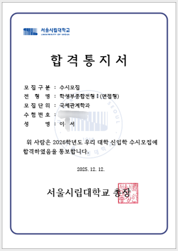 안녕하세요? 오늘은 정쌤수학을 다니고, 시립대, 외대 합격한 구암고 *서의 후기를 소개합니다. 구암고3 이○서 서울시립대학교 국제관계학과 합격 한국외국어대학교 이탈리어학과 합격 홍익대학교 자율전공 합격 국민대학교 국제통상학과 합격 4관왕을 했네요. 생김새 까지도 만화속 남주인공같이 생겨서 학교에서 인기도 많았다고 하네요. 참 훈훈한 외모입니다. 나중에 외교관이 되고 싶다는 꿈도 있었는데, 이루면 좋겠어요! 잘생기고 능력있는 외교관 상상만 해도 너무 멋지네요 수능 보기 전 직전까지 학원에 나와서 최대한 공부하고 가는 모습을 보면서, 늘 응원했습니다. 기특하고 참 장하네요. 그리고 다시 한 번 2년을 함께 관리해주시....... <img src="https://blogthumb.pstatic.net/MjAyNTEyMjdfNzUg/MDAxNzY2ODA1OTQxMjEx.BHecEI-Os0pBRVTwtF0W8gxugqHUkCb8LIXpWZTuvGEg.8JmLD-2v268eWZYYVMvlN3UXGuHopkHbGAm8Yg9RI-Qg.PNG/%C0%CC%BC%AD_%BD%C3%B8%B3%B4%EB.png?type=s3" />