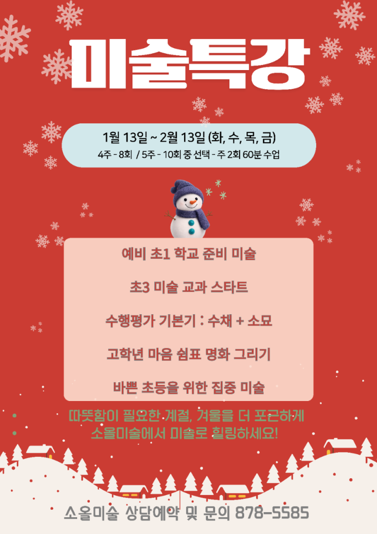 안녕하세요, 소올미술입니다. 어느새 긴긴 겨울방학이 성큼 다가왔어요. 에너지가 샘솟는 우리 아이들이 두 달 동안 건강하고 알차게 보낼 수 있도록 소올미술에서도 따뜻한 겨울 특강을 준비했답니다. 차분히 집중하는 힘부터 톡톡 튀는 창의력까지, 방학 동안 아이들이 한 단계 더 자라는 시간을 만들어주고 싶어요. “아, 이번 방학! 이렇게 보내면 좋겠다” 하는 생각이 들도록 즐겁고 든든한 프로그램으로 함께하겠습니다. ♡ 1월 13일 ~ 2월 13일까지 (화, 수, 목, 금) ➡️ 미술 수업(60분) 8회 20만원 / 10회 24만원 ➡️ 아크릴화(60분) 2회 8만원 / 4회 16만원 * 4~6명 정원제로, 요일과 시간대별로 모집 인원이 다르니 문의해 주....... <img src="https://blogthumb.pstatic.net/MjAyNTEyMDhfMjQ1/MDAxNzY1MTU3MjgzNjI1.wDlnD_pR7d2Y7faWXtzA_TL1Rm1W_P8FOQGa7YLnMcwg.Il5eDLL6RdN-mFju9hMDyn-ZRjknRJ6ASEIfv3MPYxIg.PNG/900%A3%DF1765157260089.png?type=s3" />