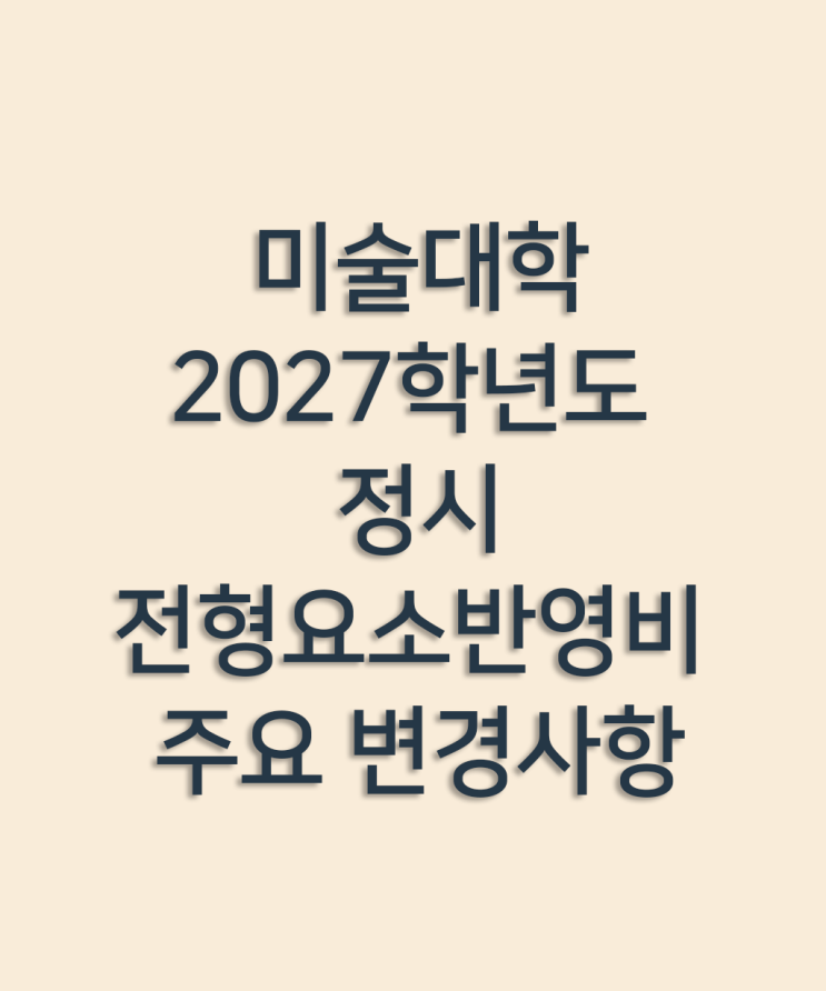 안녕하세요 미대재수학원 이지스학원입니다. 오늘은 2027학년도 미술대학 모집요강 중에서 정시 전형요소반영비 변경사항에 대해 알아보겠습니다~ 2025년 4월 발표 자료이므로 확정 공지되는 정시 모집요강을 반드시 확인하세요~ 교육 상담 02)598-0124 <img src="https://blogthumb.pstatic.net/MjAyNTEyMjNfMjM1/MDAxNzY2NDY2MDEzOTky.NKXNdNMZKMvEKbgD2CP3Btaa4OKyT5uK3a-bfk7Xa4wg.p7AZFuIVrd8QkgtNoL2IHLwmPZ6yD50QCUtp7aLqOQYg.PNG/%C0%FC%C7%FC%C1%A4%BA%B8-%B9%CC%B4%EB%C1%A4%BD%C3.png?type=s3" />