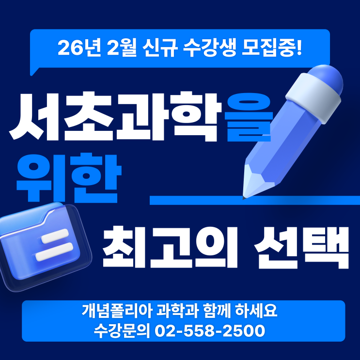 서초과학의 새로운 메카 개념폴리아 과학 2월 기존 및 신규반 개강 전원 전공자 출신으로 구성 및 소수정예 클래스 어느덧 겨울방학의 반환점을 돌아 2월을 앞두고 있습니다. 다가오는 3월 새 학년에서의 과학 성적은 남은 2월을 어떻게 보내느냐에 달려 있다고 해도 과언이 아닙니다. 개념폴리아 서초과학은 우리 학생들이 흔들리지 않는 과학 실력을 완성할 수 있도록 2026년 2월 신규반 및 기존반 프로그램을 야심 차게 준비했습니다. 이동언T 기초부터 꼼꼼히! 완벽한 개념정리는 기본 핵심문제에서 부터 심화문제까지^^ 과학의 정도를 제시하는 수업 믿고 선택하는 과학 서초 내신의 절대강자~~ <토요일 김리원T> -10시~1시 : 중등물....... <img src="https://blogthumb.pstatic.net/MjAyNjAxMjhfMTc2/MDAxNzY5NTc3NDE5MDEz.E3WY60pyicHuwhHwAN9uZ8aGWxZMaC5oIbvkMsuBYFgg.6VnqJy1HSZ0zLoJgsCuByHo2g7bX30j3m9quY9ZkDvkg.PNG/%C1%A6%B8%F1%C0%BB_%C0%D4%B7%C2%C7%D8%C1%D6%BC%BC%BF%E4..png?type=s3" />