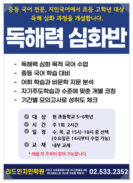 독서중심국어학원 지인국어에서 독해력의 골든 타임, 초등 고학년을 위한 <독해력 심화반> 수업을 개강합니다. 독서를 많이 하는 아이들은 국어 시험도 전부 A를 받고 1등급을 받을까요? 독서중심국어학원인 지인국어에서 답변 드립니다. 그럴 수도 있고 아닐 수도 있습니다 . 물론 독서를 많이 한 친구들은 사고력이 풍부하고 주의력과 집중력이 뛰어나 학습에 유리한 기본 소양을 가질 수 있습니다. 그!러!나! 국어라는 과목은 해당 과목의 기본기를 갖추고 또 발전시켜야 하는 또 다른 학습이 필요합니다. 그 중 중요한 것이 독해력 학습입니다. 이번에 개강하는 수업이 아주 아주 오래 걸린다는 국어 독해력을 쌓기 위한 첫 단계, 초등....... <img src="https://blogthumb.pstatic.net/MjAyNjAzMTZfNTAg/MDAxNzczNjcxMjU0ODU0.3mziraLfPy0MSuhsPF90y6Jmoyhc3CgVkFvDiXucuM0g.qL11IRc9btGCXuks1Jb6ubvJiI9q5Cv5bb-ZjQeZ_MUg.PNG/image.png?type=s3" />