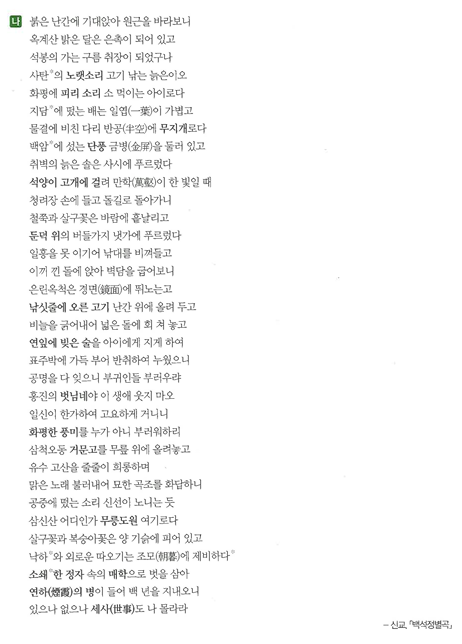■ 신교, <백석정별곡> 해제 이 작품은 작가가 1677년경 백석정이라는 정자를 짓고 창작한 가사이다. 자연 속 은거 생활의 이상을 구현한 작품으로, 자연과의 조화 속에서 유유자적한 삶을 추구하는 화평하고 즐거운 풍류의 세계를 노래하고 있다. 화자는 속세를 떠나 자연과 하나 되어 살아가는 삶을 예찬하며서, 자연의 순환성과 거문고, 음주, 시문 등 예술적 향유를 통해 조화로운 이상 세계를 그리고 있다. 핵심정리 ★ 언어비상 날다스카이 2관★ 중/고등 내신국어/수능국어 학교별/교과서별 대비 국어 문법/ 영문법 핵심개념/심화/실전 내신국어/수능국어/내신영어/수능영어 동시 대비 수능국어/수능영어 영역별 맞춤 클리닉수업 #신....... <img src="https://blogthumb.pstatic.net/MjAyNjAzMDNfMTMy/MDAxNzcyNTI3ODYxNjM4.ZkQchUWwkZLYL9ISXHeDR8i6MIO1FCxqRXYWw2CblFEg.WNb6WejNdEiHVdoU9Bk-vBugK4fZgfNzUKEmyGjKoZsg.PNG/image.png?type=s3" />