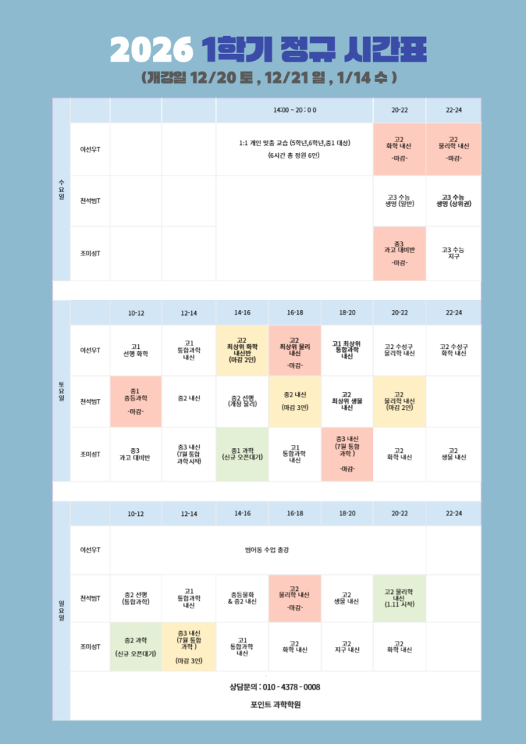 녹색으로 표시된 강의는 아직 시작되지 않은 신규 강의입니다. 강의 수강 신청 문의 010 4378 0008 (원장) <img src="https://blogthumb.pstatic.net/MjAyNjAxMDRfMTg1/MDAxNzY3NTA1Nzg1NjQx.v66AVQ5bvMkr3qQI2eVBpOaufhwTKUCKgwtjV5hbhM8g.37AJ52pswZcnJyfLp1EMYIeTO_X1DOyaZgbpWJJevkwg.PNG/KakaoTalk_20260104_115733859.png?type=s3" />