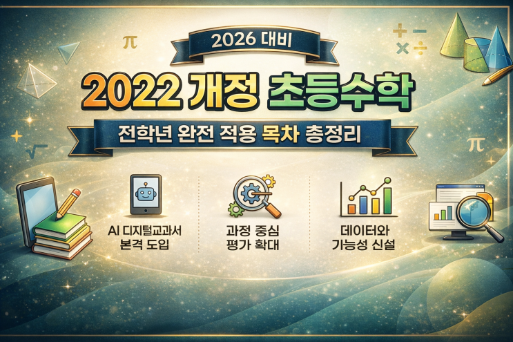 2022개정 교육과정이 드디어 2026년 초등 전학년에 완전 적용됩니다. 1~2학년은 2024년,3~4학년은 2025년부터 적용되었고 2026년부터는 5~6학년까지 모두 새 교과서로 바뀌게 됩니다. 아이가 초등학교를 다니고 있다면 올해부터는 모든 학년이 동시에 새교과서를 사용하게 된다는 뜻인데요. 특히 수학은 개념이 학년을 넘나들며 연결이 되는 과목이라 전학년 동시에 적용되는 올해 교과서 흐름을 미리 파악해 두는것이 중요한데요. 오늘은 초등수학 시매쓰에서 2026년 달라진점과 전학년 목차 정리를 해볼게요. 2026년 달라진 핵심 변화 1.AI디지털교과서 본격 도입 2026년부터 수학과목에 AI디지털교과서가 확대 적용됩니다. 종이 교과서와 함께....... <img src="https://blogthumb.pstatic.net/MjAyNjAzMDRfMjQ2/MDAxNzcyNjAzMTY4OTc2.Zwb60U1z-z0q9Z14c4Zqjpa27fTGk6Eu09q_eIywCZwg.MY3dCXW9YY2GtLBAdsgvjDRdYQXbUQuC4nmqCJQNkFYg.PNG/ChatGPT_Image_2026%B3%E2_3%BF%F9_4%C0%CF_%BF%C0%C8%C4_02_45_56.png?type=s3" />