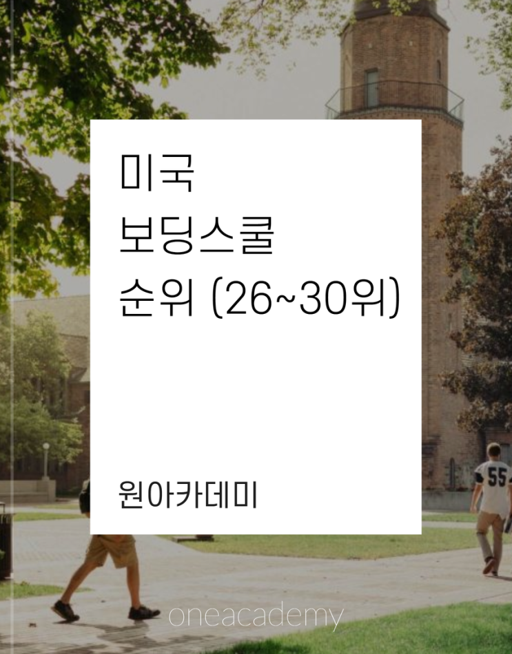 미국 보딩스쿨 순위 (26~30위) by. 압구정 원아카데미 (02-501-5590) 안녕하세요, 보딩스쿨 · 미국대학 전문 압구정 원아카데미 입니다. 오늘의 글에서는, 2026년 Niche 랭킹 기준 미국 보딩스쿨 종합 순위를 안내드리려고 합니다. 이번 글에서는 26~30위까지의 학교들을 먼저 소개하고, 다음 글에서는 31~35위의 학교들을 안내드릴 예정입니다. 보딩스쿨 랭킹은 평가 기관과 기준, 그리고 연도에 따라 비교적 유동적으로 변동되기 때문에, 순위 자체를 절대적인 기준으로 받아들이기보다는 각 학교가 지닌 교육 환경과 고유한 색깔을 이해하는 참고 자료로 활용하시는 것이 바람직합니다. 그럼 아래에서 학교별로 하나씩 살펴보겠습니다. 26위: ....... <img src="https://blogthumb.pstatic.net/MjAyNjAzMDVfMjcz/MDAxNzcyNzAzNDgxMTc3.9Ay2RXr7enZZidMJbv1XTkJQZFHPJy1WN_tZGWuqQkkg.8oiPJZPBTbhMeSHR9wXxjhEgm5H-qK8u69uXo4aza88g.PNG/%BA%B9%BB%E7%BA%BB_%BF%F8%BC%AD_%BF%A1%BC%BC%C0%CC_%286%29.png?type=s3" />