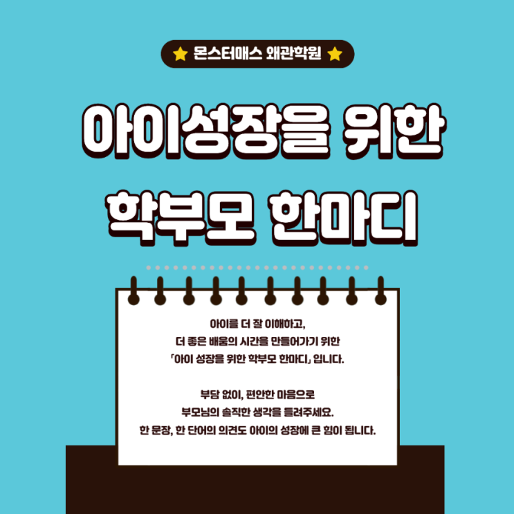 왜관수학학원 학부모 설문지 조사해보았어요 안녕하세요 몬스터매스 왜관학원입니다. 지난 1월8일은 몬스터매스 왜관학원으로 확장한지 2년이 되는날이었습니다. 정말 많은 날들이었지만 감사하게도 학부모님들의 소개로 거의 모든반이 정원 마감 직전입니다. 그동안 많은 학부모님들의 관심으로 학원이 성장하여 더 나은 변화를 위해 학부모 한마디를 만들어 보았어요. 아이 성장을 위한 학부모 한마디 아이의 작은 변화와 성장을 가장 가까이에서 지켜보시는 부모님의 따뜻한 시선이 궁금합니다. 이 설문은 아이를 더 잘 이해하고 더 좋은 배움의 시간을 만들어 가기 위한 <아이 성장을 위한 학부모 한마디>입니다. 부담없이,, 편안한 마....... <img src="https://blogthumb.pstatic.net/MjAyNjAxMTZfOTQg/MDAxNzY4NDg5MzI4NjA3._UMQB9HzjdeNQ_dohDOX0_JULyxVg8nYWctelr_J1d4g.AsrEQMk9-sXk9-P_g7bQV-zDGDtR-q60WsYYskhPoucg.PNG/900%A3%DF1768442850861.png?type=s3" />