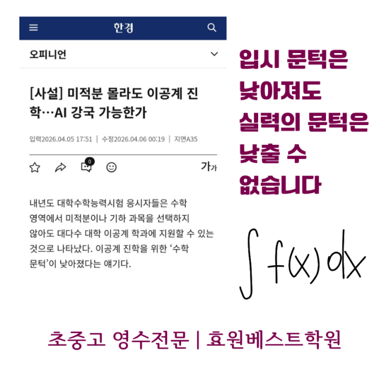 ▪️미적분 몰라도 이공계 진학? 수학 기초가 무너지고 있습니다. 2027학년도 정시 기준, 전국 174개 4년제 대학 중 166곳이 이공계 학과에서 미적분·기하를 필수 과목으로 지정하지 않았습니다. 미적분과 기하를 이공계 전 학과에 요구하는 대학은 서울대 단 한 곳뿐입니다. 더 나아가 2028학년도 수능부터는 선택과목 자체가 폐지되어, 모든 수험생이 공통수학만 풀게 됩니다. AI·반도체·양자컴퓨터의 기초 언어나 다름없는 미적분과 기하. 서울대 자연계 신입생 중 25%가 기초수학 수준에 배정됐다는 사실은 이미 경고등이 켜졌음을 보여줍니다. 미국·일본이 수학 교육을 강화하는 이유는 명확합니다. 수학이 곧 국가경쟁력이기 때문입니다. 입....... <img src="https://blogthumb.pstatic.net/MjAyNjA0MDZfMTA4/MDAxNzc1NDgwMzQ1MjU4.-Q3S0UNz_1283b32UlTqEwMr4PuAvGjynqDBMOfdNIkg.dkxo1Sy77cuR_awgSPoPLege7z1EVH7EYpP1KV0YiSEg.PNG/900%A3%DF%C0%D4%BD%C3_%B9%AE%C5%CE%C0%BA_%B3%B7%BE%C6%C1%AE%B5%B5_%BD%C7%B7%C2%C0%C7_%B9%AE%C5%CE%C0%BA_%B3%B7%C3%E2_%BC%F6_%BE%F8%BD%C0%B4%CF%B4%D9%A3%DF20260406%A3%DF142119%A3%DF0000.png?type=s3" />