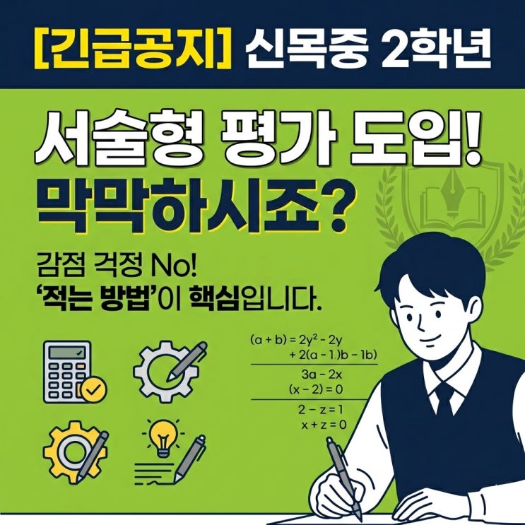이번에 신목중학교 2학년 수학 시험에 서술형 평가가 도입된다는 소식을 들으셨나요? 사실 감점의 좋은 도구였던 서술형이 몇년 만에 다시 돌아왔습니다. 객관식이나 단답형에만 익숙하던 우리 아이들이 과연 풀이 과정을 글로 잘 적어낼 수 있을지 갑작스러운 변화에 걱정하고 당황하시는 분들이 많으실 줄 압니다. 하지만 대입 약술형 논술까지 지도하며 서술형 평가의 본질을 파악해 온 제 경험에 비추어보면 서술형 평가는 결코 두려워할 대상이 아닙니다. 서술형에 대한 오해 : 서술형=어려운 문제? 많은 학생이 서술형 문제를 보면 경험이 없기에 지레 겁부터 먹기 마련입니다. 하지만 서술형은 문제 자체가 특별히 더 어려운 것이 아....... <img src="https://blogthumb.pstatic.net/MjAyNjA0MDhfMTI1/MDAxNzc1NTc1MDM0NzU0.bir2mSOC-UMmjYLj8AYILZPSa5l46fLWAPJmzDrmqXwg.FbVuydDPx1wr0n0S9NJR15ngfi26FRN0IF3A7BSu92Yg.JPEG/3f2ce03f-32db-4f01-9aee-f7091ec2ec86.jpg?type=s3" />