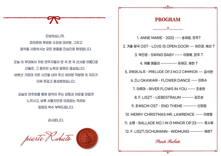 안녕하세요 피아르테 루바토 창원점입니다 ! 올해 마지막 연주회도 끝이 났습니다. 이번 연주회는 크리스마스도 있어 캐롤분위기나는 연주회 및 파티로 연출을 해보았어요 그 날의 분위기들은 따로 포스팅을 올리도록 하고~ 오늘의 포스팅은 수강생분들의 연주하시는 모습들과 곡에 관해 간단하게 설명하는 내용입니다. 이번 연주회는 강사님들이 무척이나 힘써주셨는데요, 수강생분들 학습지도와 케어, 그리고 4hands 무대들도 준비해주셨습니다. 덕분에 학원 연주회라고는 믿을 수 없을만큼 꽤나 높은 퀄리티의 연주를 감상할 수 있었어요 ~!! 그럼 서론은 여기까지로 해두고, 연주회날에 배분해드렸던 연주회 팜플렛인데요 :) 이렇게 총 1....... <img src="https://blogthumb.pstatic.net/MjAyNTEyMTlfNTUg/MDAxNzY2MTI1MDIxNTM2.y6xHjW_c2fr6vc30CAdQfM6Ny7X_PVjRFK2gon9Q3G8g.TbXSmhFEY034ZHTfcA9H5R_i8kOnS0HoPCXSOm7oxLMg.JPEG/001.jpg?type=s3" />