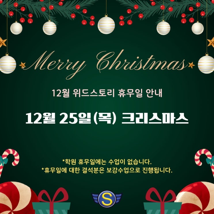 안녕하세요. 위드스토리 미술학원입니다. 위드스토리 아동미술학원 2025년 12월 휴무일 안내드립니다 ^^ 12월 25일(목) 크리스마스 휴원 *휴무일에는 수업이 없으니 수업에 착오 없으시길 바라며, 휴무일에 대한 결석분은 보강수업으로 진행됩니다. 어느덧 2025년의 마지막 달이 되었어요. 아이들의 작은 스케치 하나까지 소중히 여기며, 열심히 달린 한해였습니다. 내년에도 우리 아이들과 함께 더 많이 그리고, 더 적게 지우는 한 해가 되길 바라며, 2026년에도 예술적 감성과 실력을 모두 꽉!! 잡는 위드스토리가 되겠습니다!! ^^ 위드스토리 가족분들 남은날 마무리 잘하시고, 건강하고 행복한 12월이 되시길 바랍니다♥ 궁금한 사항은 언제....... <img src="https://blogthumb.pstatic.net/MjAyNTEyMTJfNTcg/MDAxNzY1NTI3Mjk3ODUx.12RuBGkL2TMVnLiBMet1IztTIlpM11dCxvejNYjI49Eg.cWtsEJLNmPd6dI8ITHeAe2efp_JV2JiBu5TfFtQwuXQg.JPEG/May_this_Christmas_bring_endless_joy_and_blessings_to_your_entire_family..jpg?type=s3" />