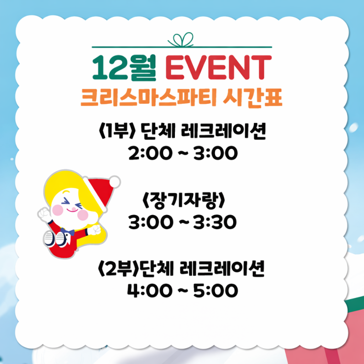 안녕하세요 삼성영어 가락학원입니다 :) 연말이 다가오면 아이들에게 가장 기다려지는 시간, 바로 크리스마스죠! 삼성영어 가락학원에서는 공부도 중요하지만, 아이들이 함께 웃고 추억을 만드는 시간도 그만큼 소중하다고 생각합니다. 그래서 올해도! 아이들을 위한 신나는 크리스마스 파티를 준비했습니다 크리스마스 파티 일정 안내 아이들이 지루할 틈 없이 없이 즐길 수 있도록 알차게 구성했습니다! 1부 | 신나는 단체게임 타임 오후 2시 ~ 3시 친구들과 함께 협동하고 웃으며 즐기는 단체 게임 시간! 처음 보는 친구들과도 금방 친해질 수 있어요 장기자랑 타임 오후 3시 ~ 3시 30분 노래, 춤, 발표 무....... <img src="https://blogthumb.pstatic.net/MjAyNTEyMTlfMjg3/MDAxNzY2MTM2Mjk3NzM0.hZC6k4EPaivMwhUs_pDvgXRQcmDYAdXvcv6OlfsxXwIg.UUHBuRbIz4e8v307p6clghHWX0V4LKdVuSwq29QIMawg.PNG/ChatGPT_Image_2025%B3%E2_12%BF%F9_19%C0%CF_%BF%C0%C8%C4_06_24_52.png?type=s3" />