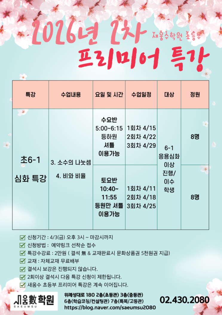 [새움수학원] 2026년 초등부 2차 프리미어 특강(4/15(수), 4/11(토) 개강)