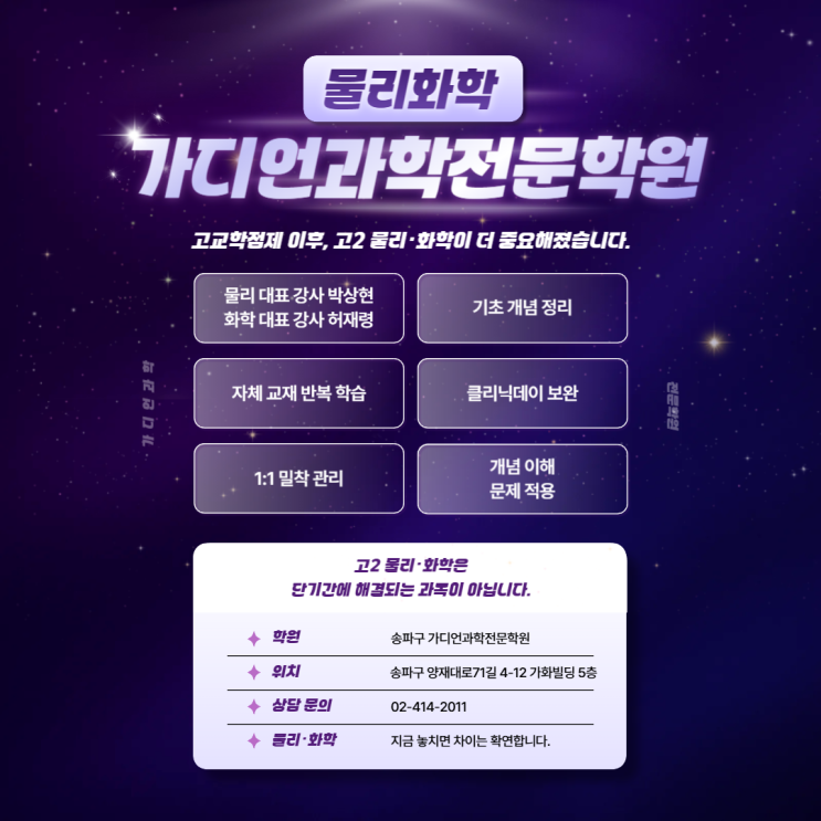 송파구 방이동 가디언과학전문학원입니다 최근 고교학점제가 본격적으로 적용되면서 고2 물리·화학의 중요성이 더 커지고 있습니다 단순한 선택 과목을 넘어서 상위권 대학에서는 물리를 중요하게 보고 일부 대학에서는 물리 이수 시 가산점을 반영하기도 합니다 또한 AI 시대가 되면서 기초과학, 특히 물리의 중요성이 점점 더 커지고 있습니다 특히 물리와 화학은 개념이 한 번 흔들리면 이후 단원까지 영향을 주는 과목입니다 그래서 처음 개념을 어떻게 잡느냐 언제 시작하느냐 이 성적을 크게 좌우합니다 송파구 방이동 가디언과학전문학원은 물리 대표 강사 박상현 화학 대표 강사 허재령 직강으로 수업이 진행되며 기초 개념부터 실....... <img src="https://blogthumb.pstatic.net/MjAyNjA0MDNfMjcy/MDAxNzc1MjAyNTk2MDAw.mrgpaSVbLEJrbvCqwU3nuatSPzvwp2EkhPuR7rf9-W8g.yHesKBwShEavBQBhn9hOioJAnjHcXU9149tyzd7ezqMg.PNG/%C1%A6%B8%F1%C0%BB_%C0%D4%B7%C2%C7%D8%C1%D6%BC%BC%BF%E4_-056.png?type=s3" />