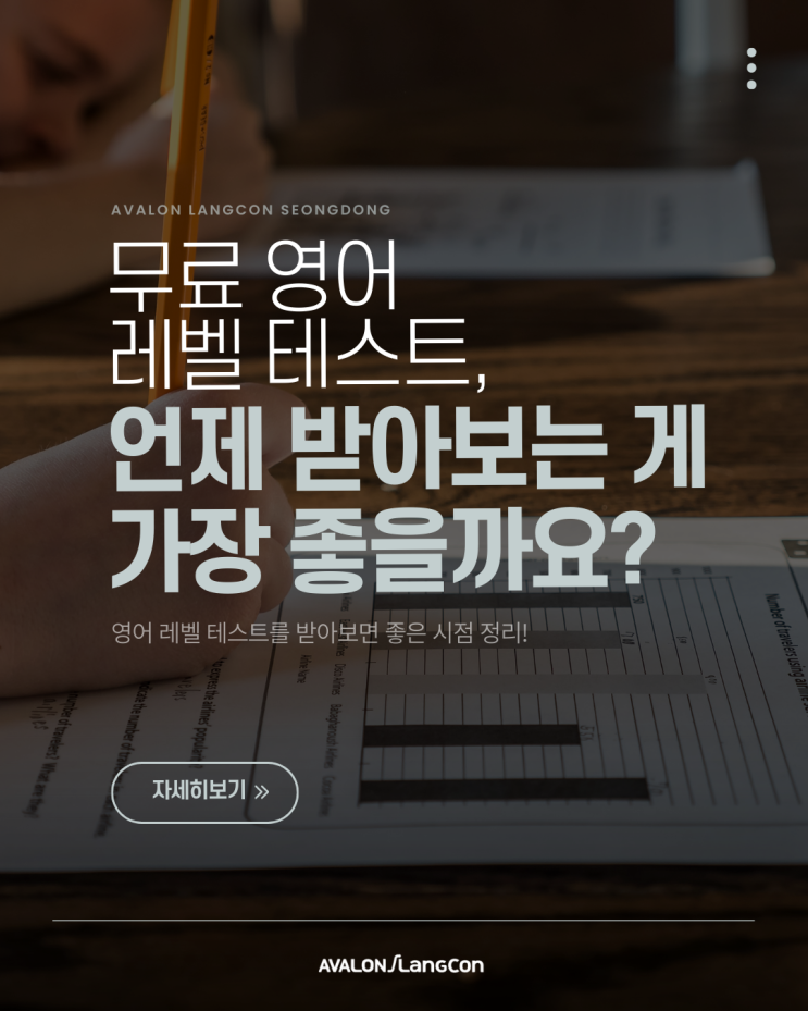 안녕하세요 왕십리 초등 영어학원 아발론랭콘 성동캠퍼스입니다. 오늘은 많은 학부모님들의 관심사이신 영어 레벨 테스트를 언제 받아보는게 가장 좋을지에 대한 포스팅을 가져왔습니다! 영어학원을 다니고 있든, 이제 막 시작을 고민하고 있든 부모님들이 공통으로 궁금해하시는 질문이 있습니다. “지금 레벨테스트를 받아보는 게 맞을까요?” “조금 더 지켜봐도 되지 않을까요?” 레벨테스트는 항상 필요해 보이지만, 늘 미뤄지는 것이기도 합니다. 그래서 오늘은 무료 영어 레벨테스트를 받아보면 좋은 시점을 부담 없이 정리해보려고 합니다. 1. 학기 시작 전, 가장 많이 선택하는 이유! 새 학기가 시작되기 전은 레벨테스트 문의가 가장 많....... <img src="https://blogthumb.pstatic.net/MjAyNjAyMTFfOTQg/MDAxNzcwNzk4NDQ0MjEx.6jjBBptX-mVKSl-Q62dEP_RaQH7EaeWtvQfv02qj37kg.4d7g4bF5kX3qrNF0kkI6sRa4kT4_CpI6kE2rBF9QYNMg.PNG/9.png?type=s3" />