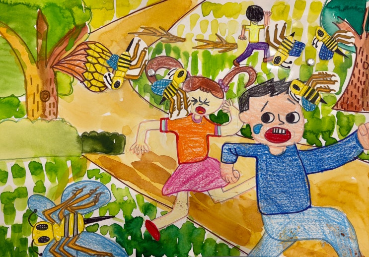 안녕하세요~! 모든 아이들이 '특별한 아이'가 될 수 있는 곳 아이니코(INIQO) 미술교습소입니다♥ 윙~!윙~! 꿀벌 대소동 દ ᵕ̈ ૩ 숲속 길을 지나가던 사람들 주변으로 꿀벌들이 갑자기 나타나 빙글빙글 날아다니는 순간을 표현한 장면이에요~! 놀란 표정과 달아나는 동작을 크게 그려 넣어 긴장감과 재미를 동시에 담아냈습니다♥ 물감으로 자연의 느낌도 너무 잘 표현했죠?♥ 이번 작품의 포인트는 꿀벌이 빙글빙글 움직이는 효과입니다~! 손으로 돌리면 꿀벌이 빙글빙글 날아다니는 것처럼 움직이도록 만들었어요♥ 미술의 재미와 상상력을 한층 더 느껴볼 수 있었던 시간이었습니다 (⋆ˆ ³ ˆ)♥ 언제든지 편하게 문의 주세요 &....... <img src="https://blogthumb.pstatic.net/MjAyNjAzMDZfMTM3/MDAxNzcyNzg4NDY5MzYw.rGUNg4SzLZjJfupnq0FFSAnsK1H4ja2UeemLWhP5Dpkg.W1nECrANx61XMaNmiBG8e8NkEIvzqjELZdD8TBwGHosg.JPEG/IMG_1354.jpg?type=s3" />
