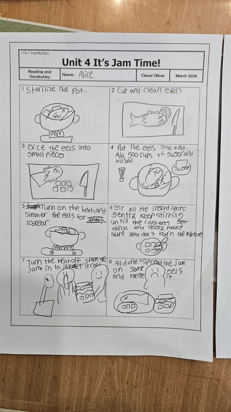 이번 Bricks Unit에서 fig jam 만드는 방법에 대한 글을 읽으며 독해 학습을 했습니다. 하지만 Clever Oliver에서는 단순히 내용을 이해하는 데에서 멈추지 않습니다. 읽은 내용을 바탕으로, 세계 여러 음식 문화까지 확장해 보았습니다. 예를 들어 영국의 젤리드 일(eel) 요리, 미국 위스콘신 지역의 마요네즈 샐러드와 같은 다양한 레시피를 함께 살펴보며, 음식이 문화와 어떻게 연결되는지도 자연스럽게 배웠습니다. 그 다음 단계에서는 아이들이 직접 자신만의 창의적인 레시피를 만들었습니다. 상상 속 재료를 넣기도 하고, 재미있는 조리 과정을 구성하면서 영어로 문장을 만들어 표현했습니다. 마지막으로, 아이들이 만든 레시피를 AI를....... <img src="https://blogthumb.pstatic.net/MjAyNjAzMTlfMTkw/MDAxNzczOTExNjA1ODY0.ds4knEoR6jh5CKGMf_j-76uebI5qiSeNP1HDrXiez3Qg.2M0x3YZM-HiU12jHrxRFII7bPHokdBMRde-ecPrbILgg.JPEG/900%A3%DF20260319%A3%DF175239.jpg?type=s3" />