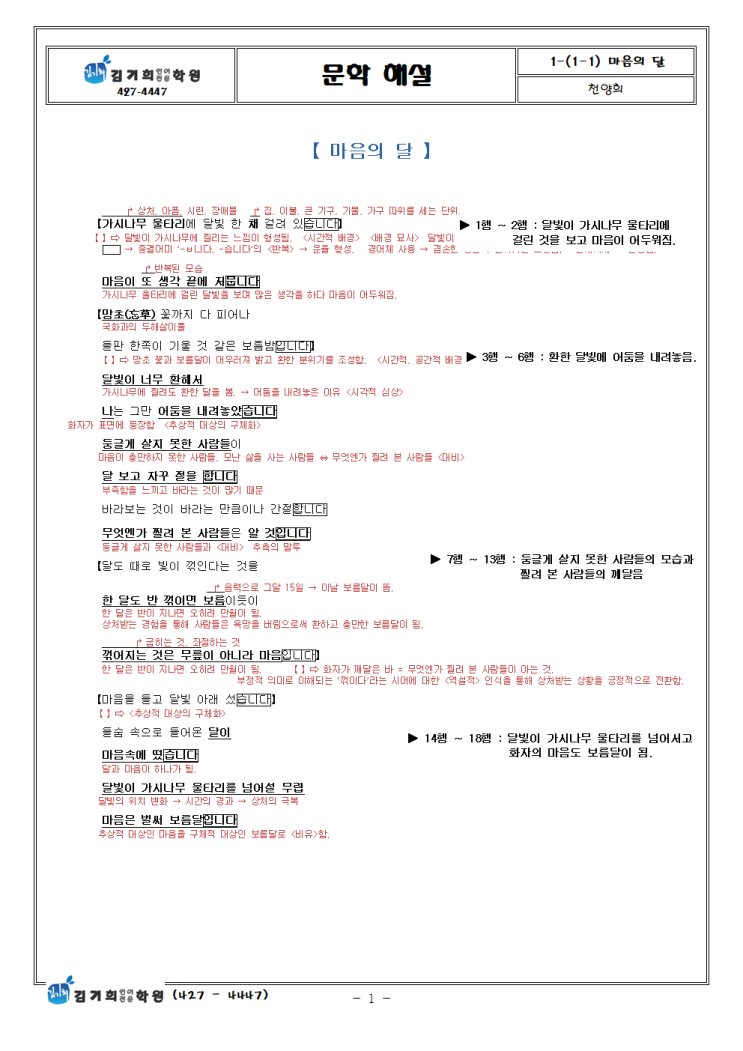 [ 미래엔 문학 해설 ] 【 마음의 달 】 - 천양희 ❚ 개관(槪觀) ❚ 가시나무 울타리에 걸린 달빛을 보며 어두워진 마음 그 환한 달빛에 어둠을 내려놓고 둥글게 살지 못한 사람들의 바람 대신 무엇엔가 찔려본 사람들이 알 수 있는 꺾어짐의 충만함을 깨닫고 느끼는 마음속의 보름달 달빛, 저묾, 환한, 내려놓음, 깨달음, 마음, 보름달, 성찰, 마음, 어둠, 대비, 만, 넘어, 보름달, 만, 깨달음, 위안, 꺾이다, 역설, 모난, 상처, 꺾어, 바라는, 마음, 보름달, 무릎, 한 달, 마음, 보름, 보름, 마음, 어둠, 깨달음, 마음, 부, 어둠, 긍, 밝음, 비유, 아름, 역설, 문학, 언어, 위로, 정, 색, 유, 역설, 징, 가시나무, 정, 역설, 위치, 시간, 마음, ....... <img src="https://blogthumb.pstatic.net/MjAyNjAyMTNfMTkx/MDAxNzcwOTkzOTgyMzQ0.fkHGfajM-3nOgaoIf_j_AcSujouJ4_hPp_t8HTomj2Yg.to5JkJANGioYs07KEvibELka-AdFQQybmgd_a-EzmW8g.PNG/1-%281-1%29_%B8%B6%C0%BD%C0%C7_%B4%DE_%28%C3%B5%BE%E7%C8%F1%29_%C7%D8%BC%B3_%BA%ED%B7%CE%B1%D7%BF%EB001.png?type=s3" />