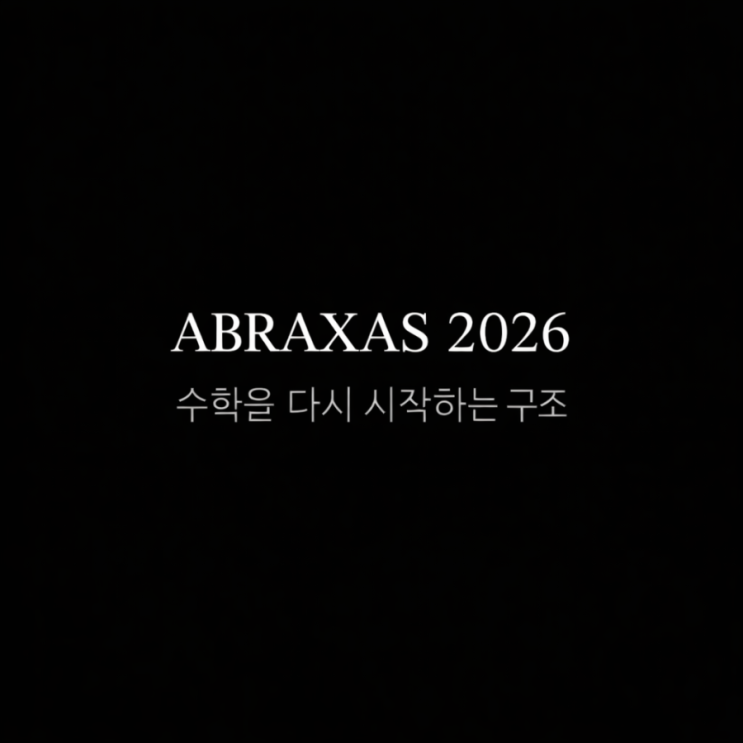 수학을 다시 시작하기 위한 하나의 구조 수학을 열심히 하는데도 왜 등급은 쉽게 바뀌지 않을까 오랜 시간 같은 질문을 반복해왔습니다. 재수종합반에서, 단과수업에서, 개인수업에서 저는 늘 비슷한 장면을 보았습니다. 포기하지 않는 학생, 분명히 노력하고 있는 학생, 그런데도 어느 지점에서 더 이상 올라가지 못하고 멈춰 서 있는 순간들. 문제는 의지가 아니었습니다. 시간의 부족도 아니었습니다. 공부의 방식과 구조가 어딘가에서 끊겨 있었습니다. 문제는 많았지만 방향은 없었고, 풀이법은 있었지만 이유는 남지 않았습니다. 그래서 한 권의 교재를 만들기 시작했습니다. 이름은 Abraxas2026 이 교재는 더 많은 문제를 풀기 위한 책이....... <img src="https://blogthumb.pstatic.net/MjAyNjAyMTdfMjk4/MDAxNzcxMjY1MTI3NDQy.kBuvaSW5PlpNGT40u5BWzd4fbeUrCQw9omKfAwY-40Ug.UwGHdRxk8zqwELUDX_2MDf_f-pwXmgpWVLoYF8qmBHYg.PNG/900%A3%DFfile%A3%DF0000000050487208a3e09ba0b0437e47.png?type=s3" />