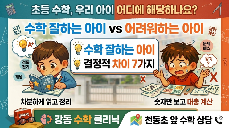 안녕하세요! 강동구 천호동, 천동초 앞에서 아이들의 수학 자신감을 책임지고 있는 [강동구 수학 클리닉]입니다. 상담을 하다 보면 가장 많이 듣는 고민이 있습니다. "우리 아이는 문제집도 여러 권 풀고 학원도 다니는데, 왜 성적이 제자리일까요?" 수학 성적은 '양'보다 '공부 습관'에서 판가름 납니다. 오늘은 수많은 학생을 지도하며 느낀 수학 잘하는 아이와 어려워하는 아이의 결정적 차이 7가지를 정리해 보았습니다. 우리 아이는 어디에 해당할지 체크해 보세요! 1. 문제를 읽는 '눈'이 다릅니다 잘하는 아이: 문제를 끝까지 정독하고 주어진 조건에 밑줄을 치며 정리합니다. 어려워하는 아이: ....... <img src="https://blogthumb.pstatic.net/MjAyNjAzMTlfMTEx/MDAxNzczOTA0OTY1MjAz.QaA6dC7cHmJe9MtDCt-srZmrG4cIFTN51tdH1lQB7l4g.IEDda-gyxQn6E2xhG0hT7P4GL_IHTO-urbjRgD57H70g.PNG/01.png?type=s3" />