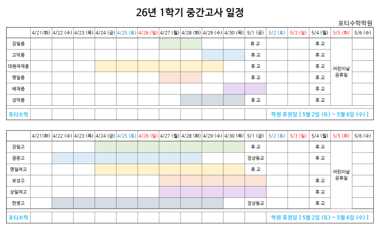 [ 고덕동 포티수학 ] 2026년 1학기 중간고사 및 학원 휴원 일정