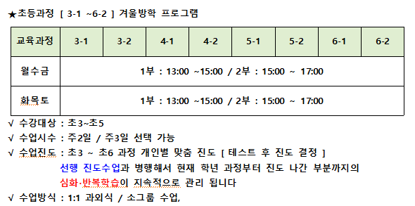 안녕하세요~ 수학을 자신없어 하는 초등학생들에게 수학 개념을 정확히 이해시켜 성적향상은 물론 학습 습관까지 잡아주는 소수 정예 수학학원 정수학입니다. 교과 수학으로 차근차근 교과서 개념을 단계별로 학습시키고 다양한 응용 문제로 실력을 키워 중요한 수학 개념 학습을 쉽고 체계적으로 이해할 수 있도록 하고 있습니다. 수학은 각 단원간의 연계성이 커서 이전 단계를 제대로 이해하지 못하면 다음 단계에서 구멍이 생기기 때문에 철저하게 학습을 거쳐야 합니다. 그래서 수학은 꾸준한 학습으로 관리해 나가야 하므로 정수학에서는 선행학습 및 심화학습, 첨삭, 숙제관리와 오답노트 관리까지 철저히 하고 있습니다. ■초등학생 겨울....... <img src="https://blogthumb.pstatic.net/MjAyNjAxMDRfMTg0/MDAxNzY3NDk0MDM5OTA0.DfaaQbu9_Mw4r3a308jTHcoibhcdbAXHyGHAvZRmbuIg.mlZnZIHcjHZ1ZO0vua1HMk2tlgF_vYTt10gAoaVxaTMg.PNG/%C1%A4%BC%F6%C7%D0%B0%DC%BF%EF%B9%E6%C7%D0%BD%C3%B0%A3%C7%A51.png?type=s3" />