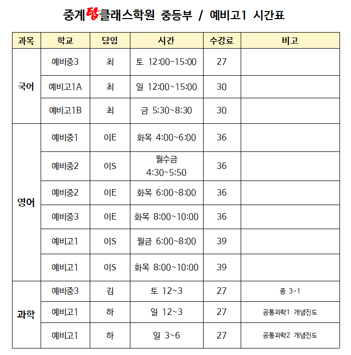 안녕하세요. 중계도 은행사거리에 위치한 고등부 전문 영어 단과 학원입니다. 중계탑클래스학원에서는 중등부 영어 단과 수업과 고등부 영어 단과 수업이 모두 고등부 전문선생님 지도아래 진행되고 있습니다. 최대정원 5명의 극소수정예수업입니다. 고등부 영어 내신대비 수업또한 학교별 내신대비반으로 꾸려집니다. 최대정원이 5명인 수업과 7명인 수업이 따로 진행되고 있습니다. 예비 고등부 1학년 영어 단과 수업이 개설되어 진행됩니다. 아직 수업을 정하지 못한 예비고1 학생들 모두 서둘러 주시길 바랍니다. 고등학교 1학년학생들은 지원 고등학교에 맞춰서 내신대비가 가능한 학원을 찾아야 합니다. 방학동안 수업을 진행하다가 갑자기....... <img src="https://blogthumb.pstatic.net/MjAyNjAxMTFfMjIg/MDAxNzY4MTEyNDc4NzEx.RrjX-hpLaLqjBT5fdbUjJ-mpdmEaoc82k2pXWgDKZUog.9a3uEv3ip90fsEmmo8wtRQ2I7ZQMefHyqGX8_gNbdmYg.PNG/%C1%DF%B0%E8%B5%BF%BF%B9%BA%F1%B0%ED1%BF%B5%BE%EE%C7%D0%BF%F8.png?type=s3" />