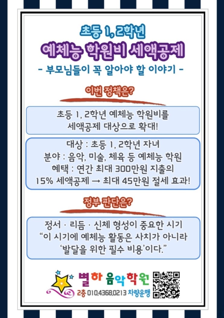 최근 초등 1, 2학년 자녀를 둔 학부모님들 사이에 큰 관심을 받는 정책이 있습니다. 바로 초등 저학년 예체능 학원비 세액공제 확대 소식입니다. 아이 교육비 부담이 만만치 않은 요즘 이 제도는 단순한 혜택을 넘어, 아이의 성장 방향과 교육 가치에 대해 다시 생각해 보게 하는 정책입니다. 별하에서도 학부모님들께 꼭 안내드리고 싶은 내용이라 정리해 보았습니다. 예체능학원비세액공제 팔판마을피아노 팔판마을음악학원 장유피아노음악학원 갑오마을피아노음악학원 새해 2026년부터 바뀌는 [초등학교 1·2학년 예체능 학원비 세액공제] 핵심은 "초등 1, 2학년 자녀 예체능 학원비도 교육비 세액공제 대상이 되며, 연간 최대 300만원 지....... <img src="https://blogthumb.pstatic.net/MjAyNjAxMTFfMjA1/MDAxNzY4MTM3NTY3MDIy.j5okGsqWjjdfYG5CH0jLmvF8heh6dpMRLgjGqh9JRVog.JAa4qhIfw_0u57KfWeIppkci0LZtseAvepo2Ev_ftTcg.JPEG/900%A3%DFScreenshot%A3%DF20260111%A3%DF220513%A3%A81%A3%A9.jpg?type=s3" />