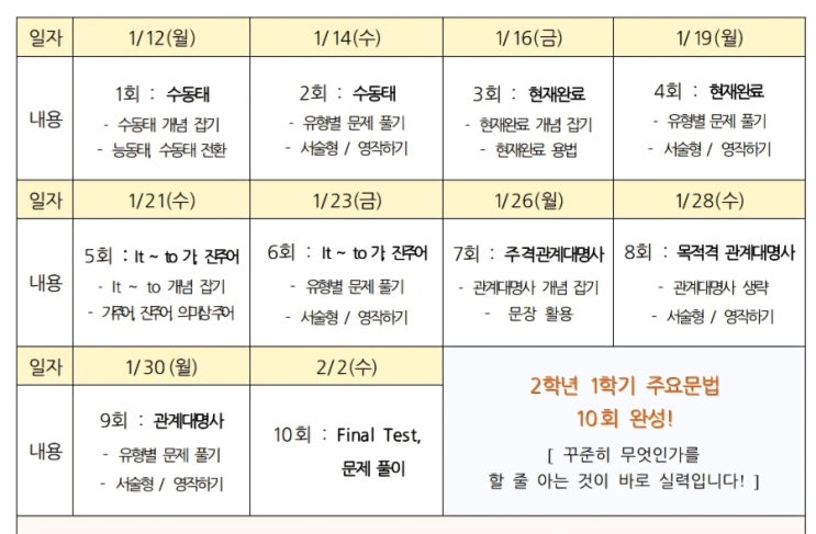 루시드어학원 중학생 겨울방학 문법 특강 기초부터 실전까지, 학년별로 완성하는 영어 실력 겨울방학은 영어 실력을 정리하고 도약하기에 가장 좋은 시기입니다. 루시드어학원 겨울방학 특강은 중학교 학년별 학습 흐름에 맞춰, 문법 개념 이해 → 문장 적용 → 내신 대비까지 체계적으로 설계되었습니다. 중1 : 영어의 뼈대를 세우는 핵심 문법 완성 중1 과정은 영어의 기초가 되는 문장 구조와 품사 이해에 집중합니다. 8품사, 문장의 5형식, be동사와 일반동사, 시제, 접속사, to부정사, 조동사까지 중1 1학기 핵심 문법을 10회로 압축 정리합니다. ✔ 문장을 해석이 아닌 구조로 이해 ✔ 서술형·영작 훈련으로 내신형 문제 대응력....... <img src="https://blogthumb.pstatic.net/MjAyNjAxMTVfMzIg/MDAxNzY4NDgwNDk2MTgz.22rXRPqx9-TtAFCcU5S4JhQqCa9y-muHjGiZj1ILrnkg.Pp_95jUByanWIXwPGD5aG91_t5PqAMrDyoaaCWov7bIg.JPEG/900%A3%DF1768479810537.jpg?type=s3" />