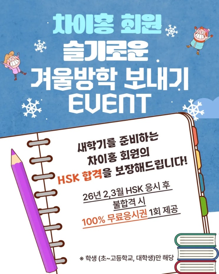 大家好 차이홍화명중국어교습소입니다. 2026년 새해가 밝았습니다! 새해에 목표한 시험공부 시작하셨나요? 요즘 같이 추운 날씨 시험공부하기에 딱 좋은 것 같아요! 그래서 #차이홍화명중국어교습소에서는 HSK 수강생을 위한 기간 한정 이벤트를 준비했습니다. 이벤트 내용 ️대상: 학생 (초~고등학생, 대학생) ️기간: 2월~6월 ️2, 3월 시험 응시 후 불합격시 무료 응시권 제공 ️HSK 지필 / IBT, HSKK IBT 포함. #차이홍화명 중국교습소에는 단기간에 HSK를 합격한 우수 사례가 많습니다. 경험 많은 원장님이 개인 실력에 맞춘 맞춤형 학습 플랜을 제공하며, 실전 대비 모의고사와 취약점 보완 수업으로 학습 효율을 극대화합....... <img src="https://blogthumb.pstatic.net/MjAyNjAxMTRfMjUw/MDAxNzY4Mzg1OTk0MTMz.Rk4bVuuOSTZSzSnABs-uKxiQkbEvtiVw0Tmqj_ASOd0g.CydgFfrn5mXw2w_bx0vxEXmJRLIcrOPM745O4HV_SNMg.JPEG/900%A3%DF1768385730503.jpg?type=s3" />
