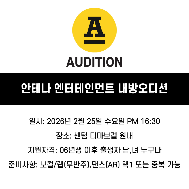 안테나 엔터테인먼트 내방오디션 안내 센텀디마보컬에서 안테나 엔터테인먼트 내방오디션이 진행됩니다 ! 오디션 일정 일시 : 2026년 2월 25일(수) PM 4:30 장소 : 센텀 디마보컬 원내 지원 자격 2006년생 이후 출생자 남녀 모두 지원 가능 준비 사항 보컬 / 랩 : 무반주 댄스 : AR 1곡 ※ 중복 지원 가능 내방오디션에 관심 있는 학생들은 사전 준비 및 문의 바랍니다. <img src="https://blogthumb.pstatic.net/MjAyNjAxMTRfMTkz/MDAxNzY4MzcyNzY2OTA1.b2iuXdLoSyvhtgqV0gwoW6kFEGLKSF9EKBgr5VxpsdAg.CCFKVGB3ZZT3BDlGxk_r03aQwZb7Ua56-0DCFNjTZF0g.PNG/%BE%C8%C5%D7%B3%AA%BF%C0%B5%F0%BC%C7.png?type=s3" />