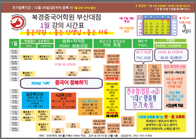 부산대점 1월 시간표 : 1월 5일(월) 개강 조기등록 : ~12월 26일(금)까지 할인 * 전수업(입문~6급) 1대1 "맞춤형" 단기속성 수업 1월 특강반 : 소수 그룹 수업 / 교차 수업 가능 / 조기등록 10% 할인 1. "왕초보-2" 특강반 : 틀을 잡아주는 중국어 : 월~금 PM 2:00~4:00 (100분 수업) 2. "4급 실전" 특강반 : : 월,화 PM 1:00~2:30 (90분 수업) : 금 PM 1:30~3:00 (90분 수업) 3. "5급 실전" 특강반 : : 월~금 PM 3:00~5:00 (100분 수업) 4. 주말 HSK 및 HSKK 회화반 : 토요 집중반 : AM 9:00~PM 8:00 : 시간 선택 자유 / 소수 그룹 수업 / 1:1 개인 수업 5. 기초회화 수업 : 틀을잡아주는중국어 입문/기....... <img src="https://blogthumb.pstatic.net/MjAyNTEyMjBfMjcz/MDAxNzY2MjIzNjY5OTA3.pZxoTNwrDxKRfD-0aKNkmrAd4aoxRm9EXXwr9FShYZgg.AO6U4p2cQ0A3sQh6_s1YcvExBOO8QBQ3GwWFay6FPasg.PNG/1%BF%F9_%BD%C3%B0%A3%C7%A5.png?type=s3" />