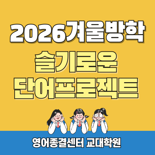 안녕하세요. 영어종결센터 교대학원장입니다. 고등 영어에서 실력을 가르는 가장 큰 기준은 결국 단어 체력입니다. 문법을 알아도, 구문을 해석할 줄 알아도, 단어가 받쳐주지 않으면 문장은 끝까지 읽히지 않습니다. 그래서 영어종결센터에서는 매 방학마다 슬기로운 단어 프로젝트를 진행해왔습니다. 2026 겨울방학 미션 슬단프 슬단프란? (슬기로운 단어프로젝트) 슬기로운 단어 프로젝트의 핵심은 단순합니다 중학생은 100개 하루 100개, 고등학생은 하루 200개의 단어를 학습하며 매일 새로운 단어와 누적 테스트를 통해 복습 효과를 극대화 시킵니다. 슬단프 교재 단어종결자 영단어종결자는 수능 영어와 연계율이 높은 핵심단어들로 구성....... <img src="https://blogthumb.pstatic.net/MjAyNjAxMDZfMjc5/MDAxNzY3Njg4ODIxODQ4.p5nekhVP_BwRBLqR1jUMTcz3wCS0qupDzrrZojAAC6Mg.DZ1PTxzhmxxy2KWSJwyr02UYp7AwsygrtI2GGoc3_XMg.PNG/%B1%B3%C0%B0%C1%A4%BA%B8-003.png?type=s3" />