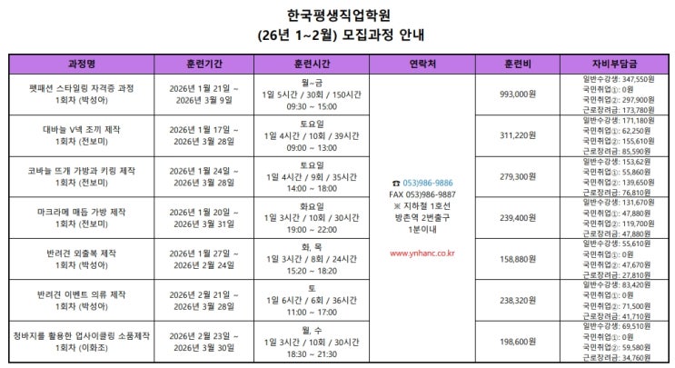 한국평생직업학원 / 한국문화센터 대구중앙지부 입니다 :-) 2026년 국민내일배움카드 국비훈련이 시작되었습니다! 훈련생들의 다양한 요구사항을 반영하여 새로운 과정들이 신설되었으니 많은 관심 부탁드립니다 국민내일배움카드 일명 '내배카'의 궁금증! 모두 해소해드립니다~ 내배카 Q&A 국민내일배움카드는 어디서 발급하나요? 온라인 : 고용24(www.work24.go.kr), 오프라인 : 거주지 관할 고용센터 방문 누구나 발급할 수 있나요? 대한민국 국민이라면 누구나! 발급 가능하지만, 일부 제외 대상이 있습니다. 만 75세 이상, 졸업 연한이 3년 이상 남은 학생, 대기업 종사자, 공무원, 연 매출 4억이상 자영업자 등 자세한....... <img src="https://blogthumb.pstatic.net/MjAyNjAxMDhfMjk3/MDAxNzY3ODQ1MDE5NTQ4.cv08YBQI4V-nyGynqsSTvexoXus7EeWzLdrM3xuK5hAg.dmrAobqabWD8frFF5COnkWOgTXDdYNdkzL_0YW4v4Ycg.JPEG/%C7%D1%B1%B9%C6%F2%BB%FD%C1%F7%BE%F7%C7%D0%BF%F8_%282026%B3%E2_12%BF%F9%29_%B8%F0%C1%FD%B0%FA%C1%A4_%BE%C8%B3%BB_1.jpg?type=s3" />