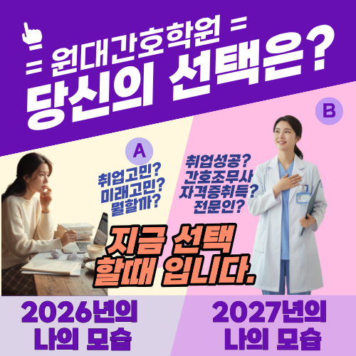원대간호학원 3월 25일 간호조무사 과정 개강 안내 안녕하세요. 원대한 꿈을 꾸는 원대리 인사드립니다. 어느덧 겨울이 지나고 따뜻한 봄이 찾아오고 있습니다. 3월이 되니 거리 곳곳에서 꽃이 피기 시작하고, 새로운 계절이 시작됩니다. 봄은 항상 새로운 시작을 떠올리게 하는 계절입니다. 많은 분들이 이 시기에 새로운 계획을 세우고 미래를 고민하기도 합니다. 지금 이 글을 보고 계신 분들 중에도 “지금 무엇을 시작해야 할까” “앞으로 어떤 일을 해야 할까” 이런 고민을 하고 계신 분들이 있을 것입니다. 그래서 오늘은 이런 이야기를 해보려고 합니다. 지금 시작하면 2027년 여러분의 미래는 달라져 있을 것입니다. 지금 시작하면 1년....... <img src="https://blogthumb.pstatic.net/MjAyNjAzMTVfMjM1/MDAxNzczNTg2NjM5NzIx.3Wg7uyE8psoEGjIsgkDO5fxZc_b3wDExd8TqLlhh8Qgg.QREHojgpsIzbHLVLxd1Ijxui_9PRkVhgnvxItmKg2x8g.PNG/%C1%A6%B8%F1%C0%BB_%C0%D4%B7%C2%C7%D8%C1%D6%BC%BC%BF%E4._%288%29.png?type=s3" />