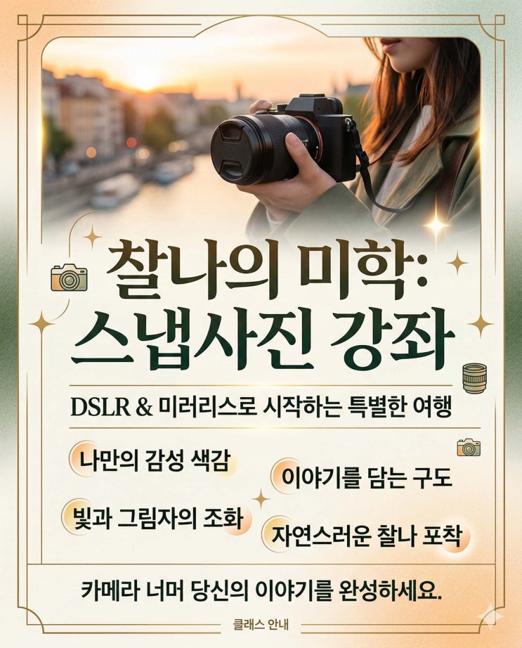안녕하세요! 여러분의 잠든 감성을 깨워줄 AI+유튜브영상학원입니다. ✨ 혹시 큰맘 먹고 비싸게 산 DSLR이나 미러리스 카메라를 방 한구석에 방치해 두고 계시진 않나요? 또는 매번 **'자동(Auto) 모드'**로만 찍으면서 "왜 내 사진은 인스타그램에 나오는 것처럼 예쁘지 않을까?" 고민하신 적 있으신가요? 이제 그 고민, 저희가 해결해 드리겠습니다! 단순한 카메라 이론 수업이 아닌, **'철저한 실무와 결과물 중심'**의 확실한 스냅사진 강좌가 여러분을 기다립니다. 이런 분들, 지금 바로 주목해 주세요! 카메라 왕초보: 조리개? 셔터 스피드? ISO? 용어부터 막막해서 카메라 전원만 켜보신 분 감성....... <img src="https://blogthumb.pstatic.net/MjAyNjA0MDZfMTI1/MDAxNzc1NDM2ODYyNzQ2.nv891yJK_IYkkfPx-zegj9ktm2LDCZmtKN8cAqaxsLsg.LIb3PpZddlOZ1e6tf3wQG_xM1zan9ghMJa965wsPWXUg.JPEG/스냅사진0415.jpg?type=s3" />
