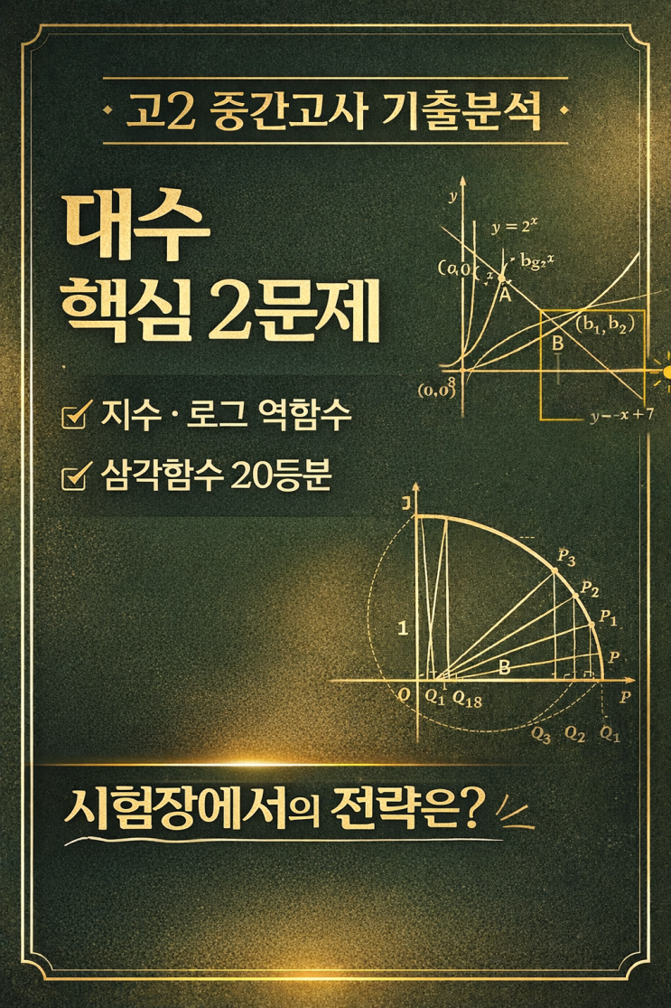 고2 대수 중간고사, 점수 갈리는 핵심 2문제 분석 1️⃣ 지수·로그 함수 문제 분석 1) 학생들이 막히는 이유 ✔ “그냥 교점 구하려고 함” ✔ 식 계산으로 밀어붙이다가 시간 초과 ✔ 로그 ↔ 지수 관계를 연결하지 못함 2) 핵심 접근 전략 이 문제의 본질 = “역함수 관계 활용” 로그 그래프를 직접 보지 말고 지수함수로 ‘변환해서’ 생각해야 한다! 3) 결정적 포인트 대칭 이동한 그래프 좌표 비교 문제 → 그래프 위치 비교 문제로 변환 4) 난이도 중상 (상위권 변별 문제) 계산량 ❌ 사고 전환 ✔ 그래프 해석력 ✔✔ 5) 한 줄 정리 “로그를 계산하려 하지 말고, 지수로 바꿔서 바라보는 순간 풀린다....... <img src="https://blogthumb.pstatic.net/MjAyNjA0MDdfMjAz/MDAxNzc1NDk4MjA2NDQx.85aJC5it8Ah84HerJX6J76dJhE0mls7Fw_-o9hzaFXEg.j_PsFBe_JaK6GCJiG_crkIE_l7Nxwo5SLsxl-cst5MQg.PNG/%B4%EB%BC%F6_2%B9%AE%C1%A6.png?type=s3" />