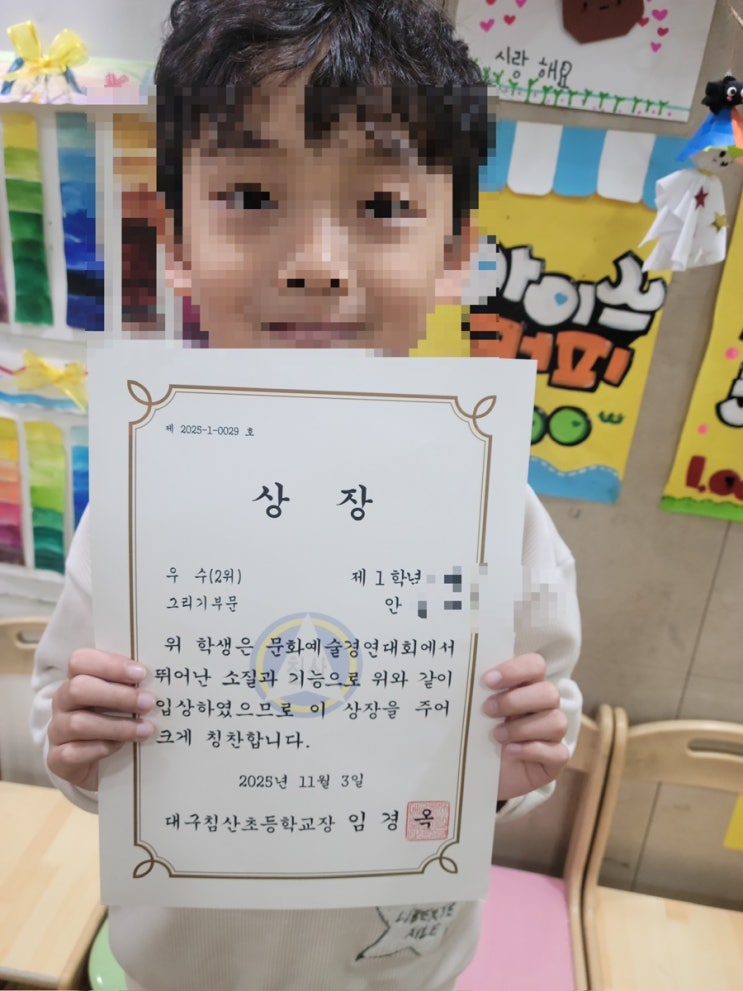안녕하세요! 2025년에 침산초등학교와 달성초등학교에서 진행한 문화경연대회에서 최우수, 우수, 장려를 받게되어 이렇게 글을 씁니당 4학년이라 바쁜데도 짬을 내서 학원을 다니는 김** 미술 시간이 스트레스 풀리는 시간이라구 하더라구요 1학년부터 3학년 2학년 3학년까지.. 사진은 없지만 참 많은 침산 친구들이 상받아왔더라구요~~ㅎㅎ 달성초등학교 4학년 친구도 장려 받아왔네용❤️ 조형활동(만들기)와 그리기를 병행하여 수업하고 있어요! 아이들이 흥미를 잃지 않도록 조형활동에 드로잉, 명암, 묘사를 함께 결합하여 수업커리큘럼을 연구하고 단체작품만들기를 통해 조화로움을 배우고 정물묘사가 재미없지 않게 종이아트를....... <img src="https://blogthumb.pstatic.net/MjAyNjAxMDhfMjM1/MDAxNzY3ODczMTg5NTcw.ySQuMPrQSOhajCoJBMuZqzsTgaNgEslN9Tz3zmfp_jsg.pwgNgHdOEUkvh4nzNDltfBxEngc12YEG4k59xU2NsKcg.JPEG/output%A3%DF3660772706.jpg?type=s3" />