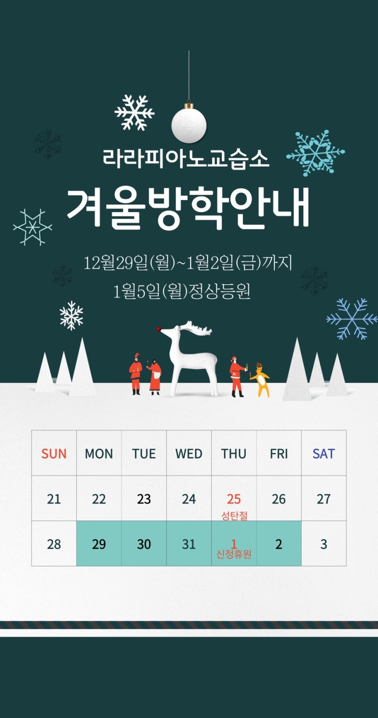 ❄️라라피아노 겨울방학 일정안내❄️ [겨울방학 운영시간] 오후 1시-6시 [라피 겨울방학] 12월29일(월) - 1월 2일(금) 1월1일(목) 휴원 크리스마스&겨울방학 기념 12월 24일 (수) <img src="https://blogthumb.pstatic.net/MjAyNTEyMzBfMjQz/MDAxNzY3MDYzMjEzOTIy.CLjSDRG_ArqK8xfhYESdj1Uz638vVUqLps3xK-K5e3Ig.6BeglTtZqoIblMSHAJLlIFJJh72xtQSu0CK1Sdup_N0g.JPEG/%C1%A6%B8%F1%C0%BB%A3%AD%C0%D4%B7%C2%C7%D8%C1%D6%BC%BC%BF%E4%A3%DF%A3%AD001_%A3%AD_2%A3%A82%A3%A9.JPG?type=s3" />