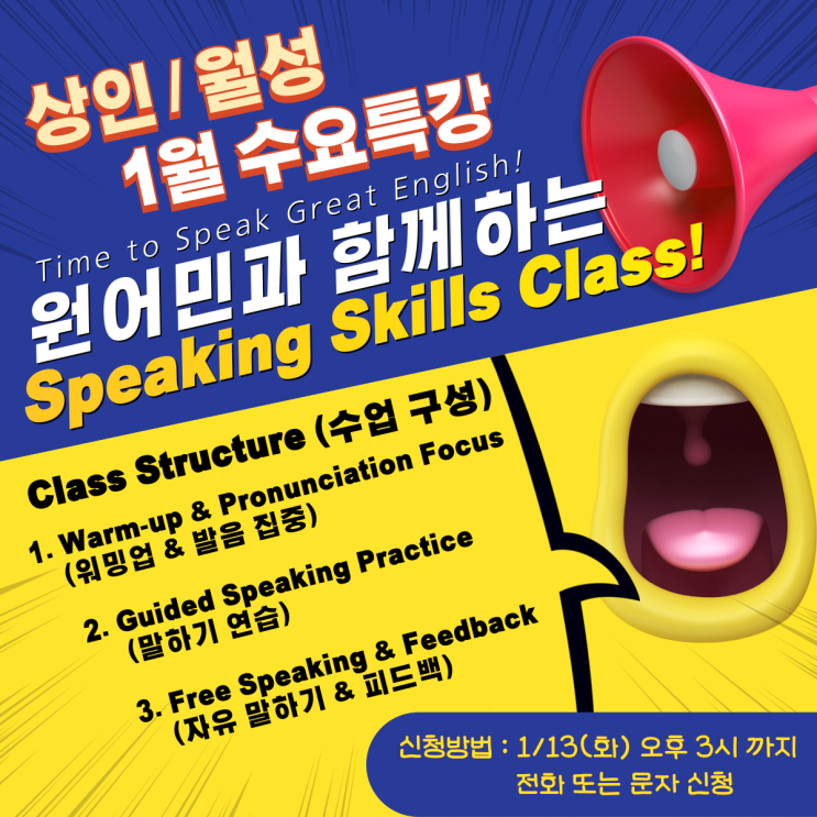️ 원어민과 함께하는 영어 말하기 특강! ✔ 수업 구성 안내 발음 & 워밍업 말하기 연습 자유 말하기 & 원어민 피드백 듣기만 하는 수업이 아니라, 직접 말하는 시간이 충분한 수업입니다! 지점별 수업 방식 안내 (중요) ⚠ 지점별로 수업 방식과 시간이 다르며, 변경이 어렵습니다. 신청 전 꼭 확인해주세요. 상인지점 (Zoom 온라인 수업) 대상: 초등/ 중등 수업일: 1/14, 1/21, 1/28 (수) 시간: 19:00 ~ 19:50 출석 기준: 수업 시작 후 15분 이내 접속 월성지점 (오프라인 등원 수업) 대상: 초등 수업일: 1/14, 1/21, 1/28 (수) 시간: 16:00 ~ 16:50 (셔틀 운행❌) 수강료 & 출석 혜택 안내 수....... <img src="https://blogthumb.pstatic.net/MjAyNjAxMDhfMTgz/MDAxNzY3ODU5NzgwNTM0.n2td4bK7S1kyr-gCJO7FDP1Ou81p3ThldAt5-xFIp4Eg.VIdWkjTNp6ZtFnTWCH8MTpwJLZzlo15gG3R0lTTQDCwg.PNG/001.png?type=s3" />